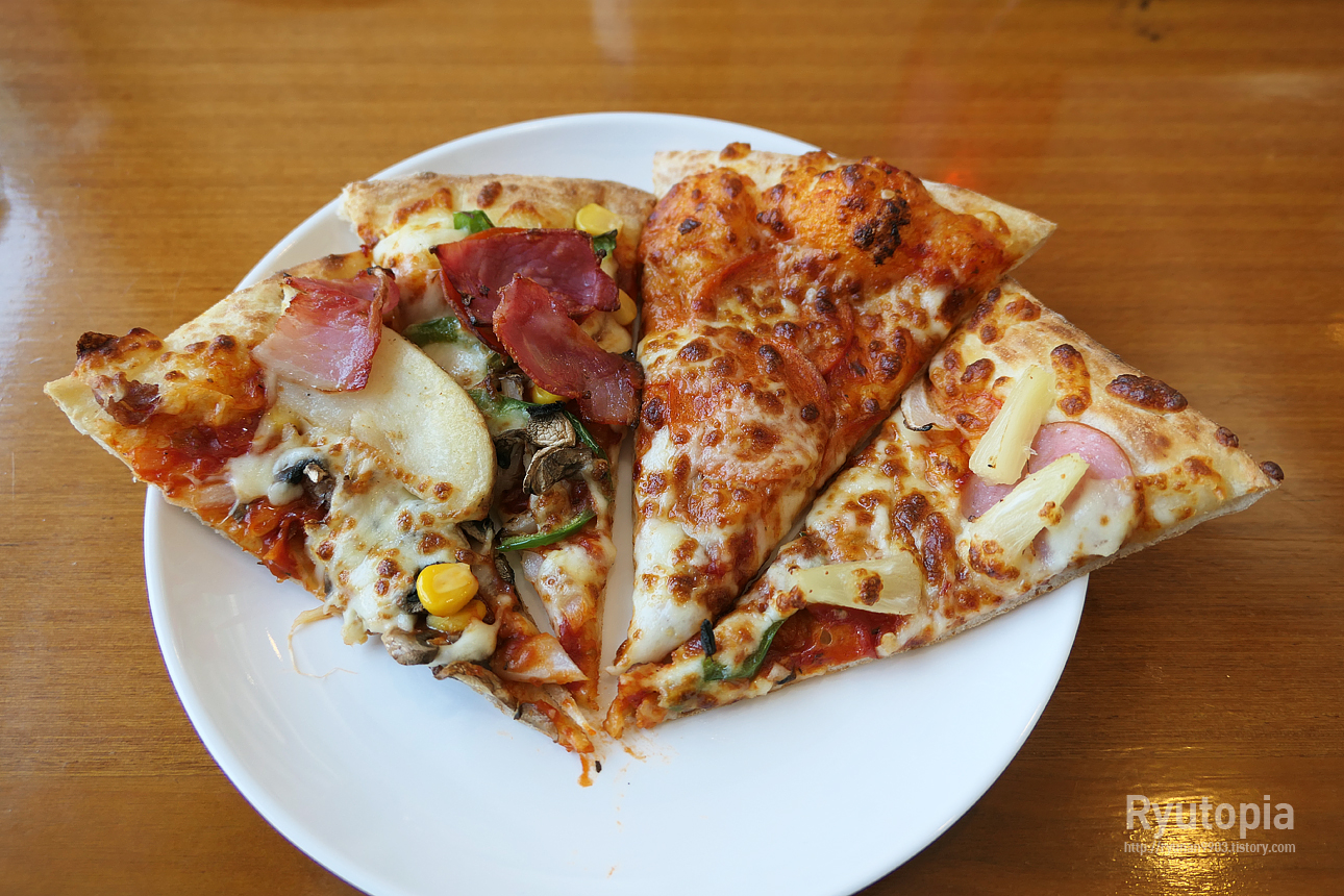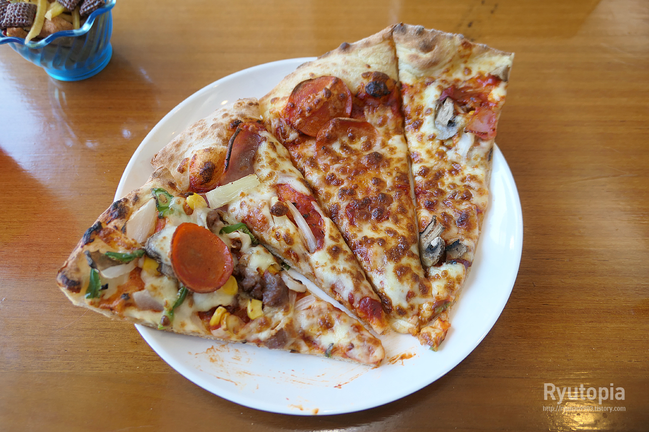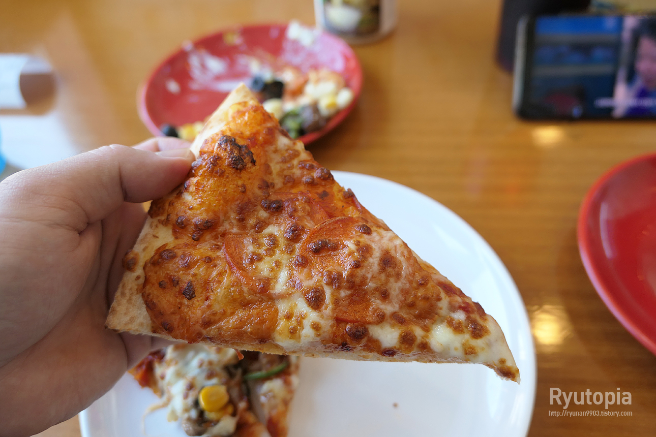 오늘 제공된 피자는 이렇게 총 네 쪽. 확실히 혼자 먹으니 주변 속도나 상황 신경쓰지 않고 먹는데 집중할 수 있어 편하더군요.