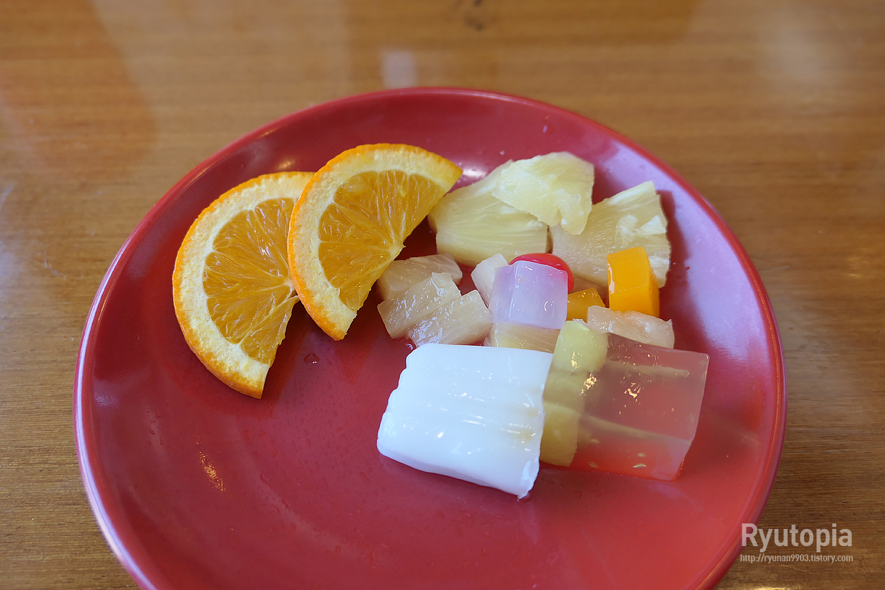 오렌지와 파인애플 등의 과일과 후르츠칵테일, 그리고 젤리 약간.