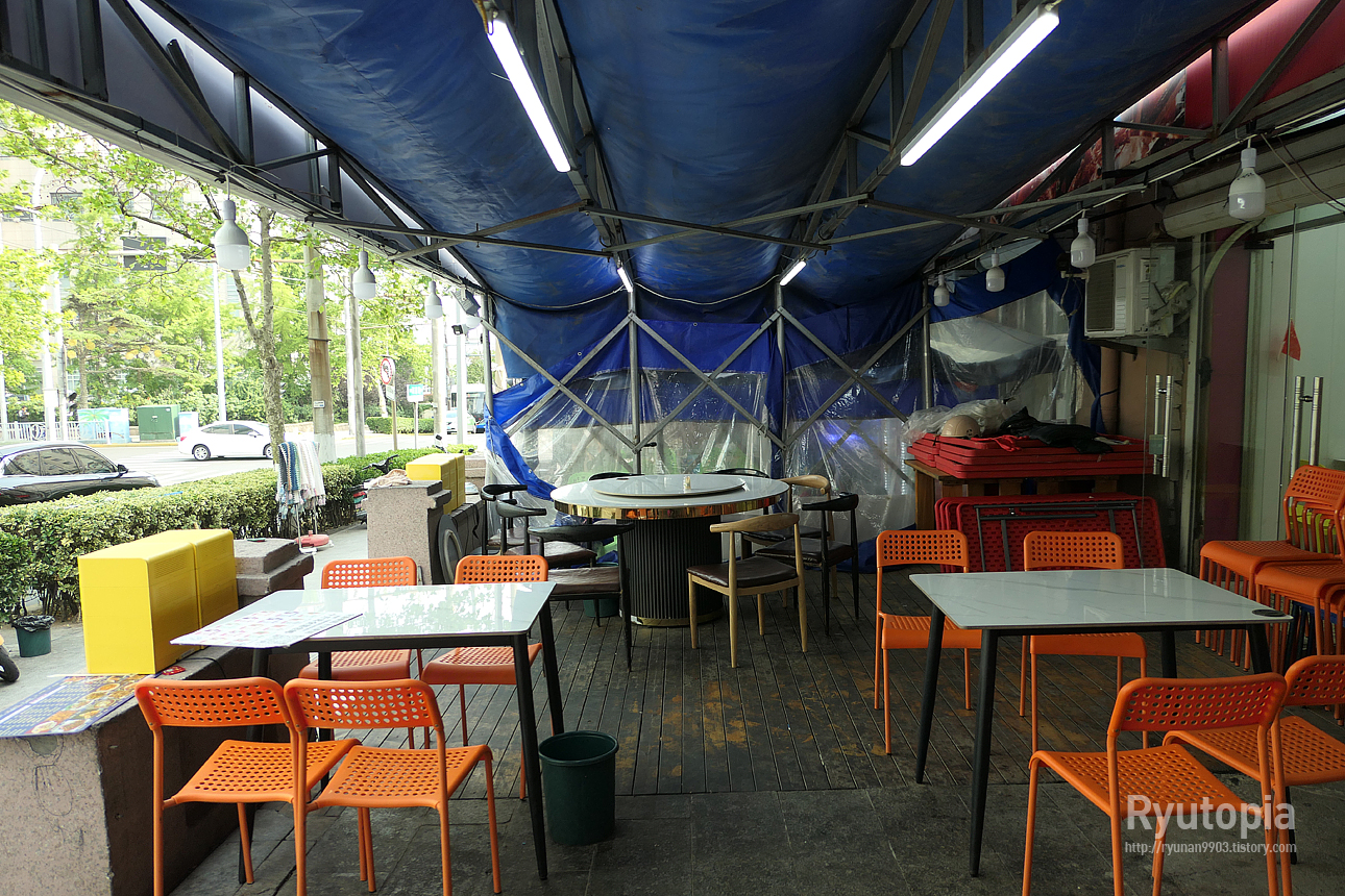 이렇게 목조 바닥에 천막을 대충 친 야외 테이블이 설치되어 있고 저기 보면 여럿 앉을 수 있는 돌리는 원탁테이블도 있음.