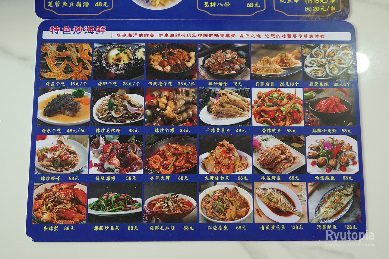 왕지에 바베큐는 꼬치구이 외에도 다른 요리들도 취급하는데, 메뉴판을 이렇게 직접 가져다주었음.