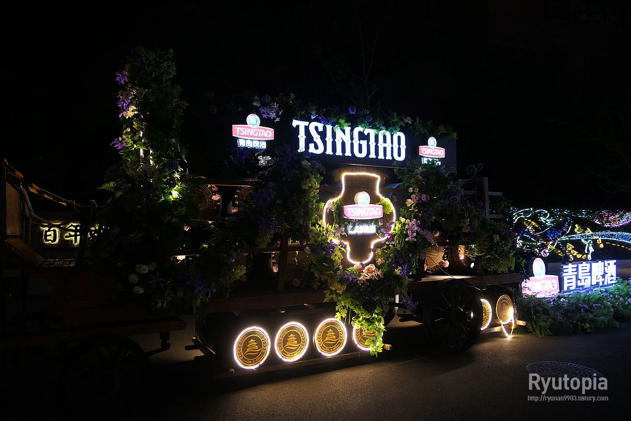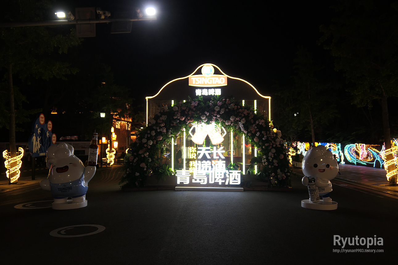 바다로 나가는 길목엔 칭다오 맥주를 홍보하는 각종 조형물이 엄청 많이 전시되어 있었다. 게다가 밤이라 불을 밝혀놓음.