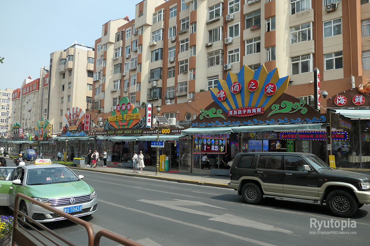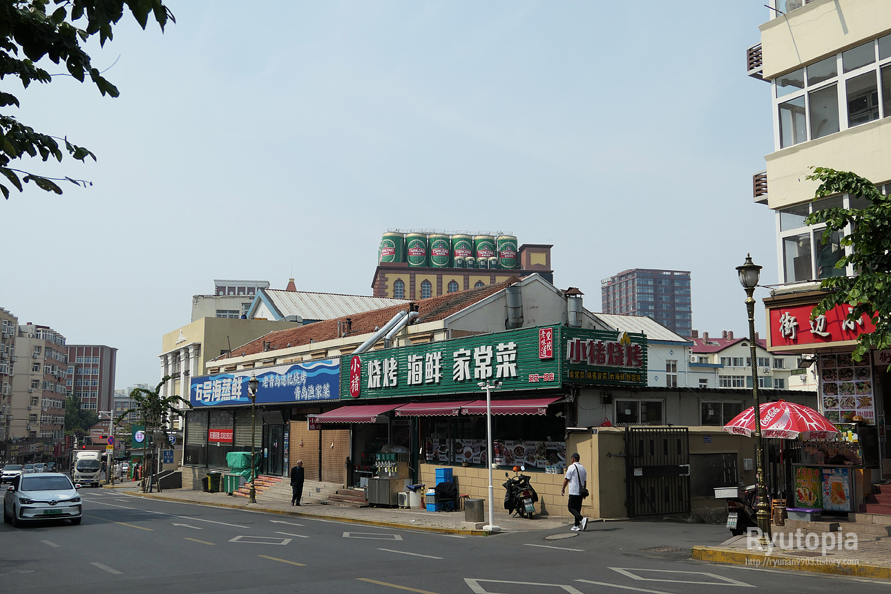 어쩐지 칭다오 맥주랑 요리 파는 가게들이 하나둘씩 보이기 시작하고 저 뒤로 뭔가 수상한(...?) 건물 하나가 보인다.