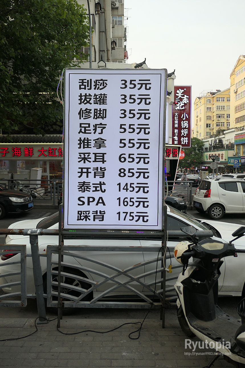 칭다오의 마사지샵도 일단 정찰제를 유지하고 있기 때문에, 가게 앞에 이렇게 가격표가 붙어있다.
