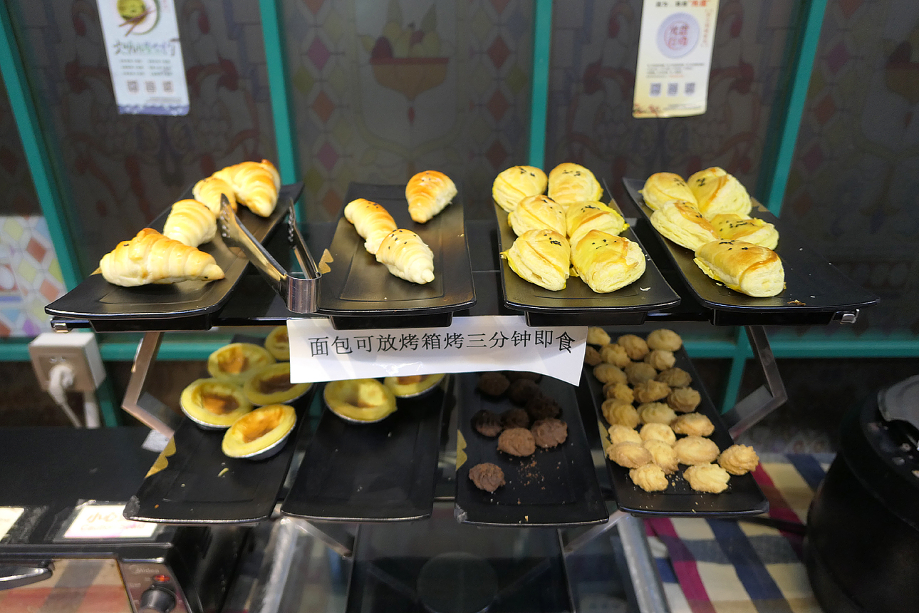 디저트 코너에는 크루아상 모양의 모닝빵, 두리안 페스츄리, 에그타르트, 그리고 초콜릿과 버터 두 종의 미니쿠키가 있음.