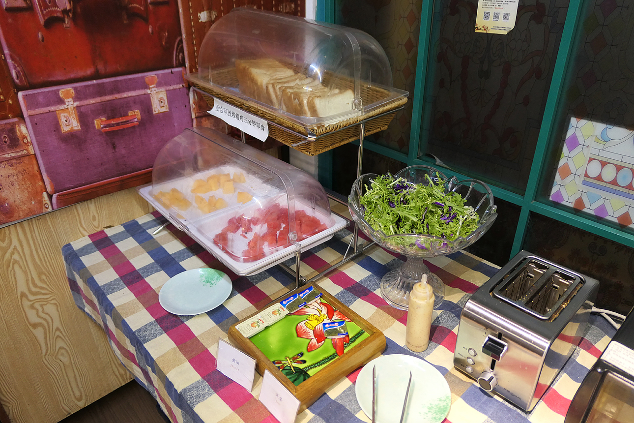 식빵과 함께 멜론, 수박의 과일 두 종이 준비되어 있고 만다린잼, 그리고 버터가 구비되어 있음. 오른쪽에 토스터기도 설치되어 있다.