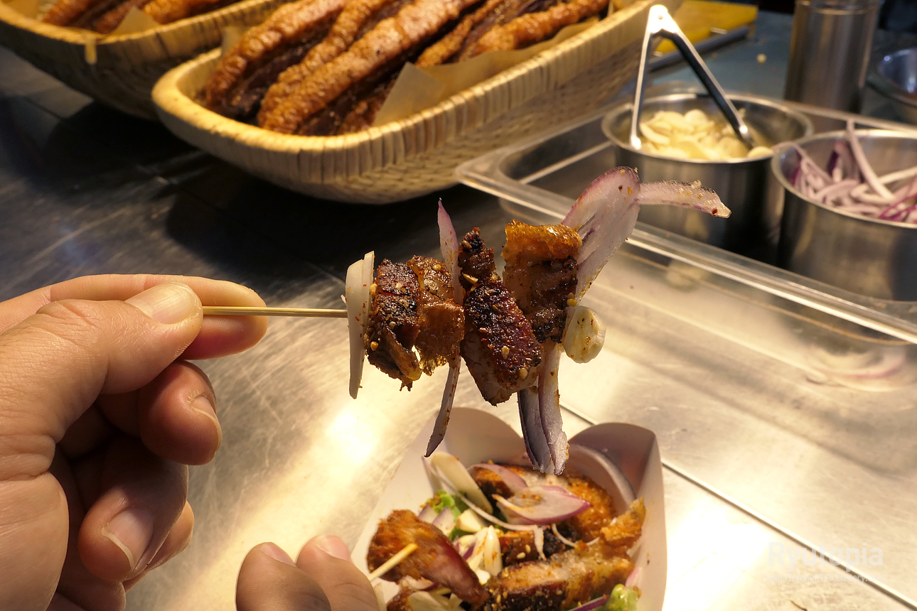 꼬치에 돼지고기 오겹살을 이렇게 길쭉하게 꽂은 뒤 그대로 튀겨내었는데