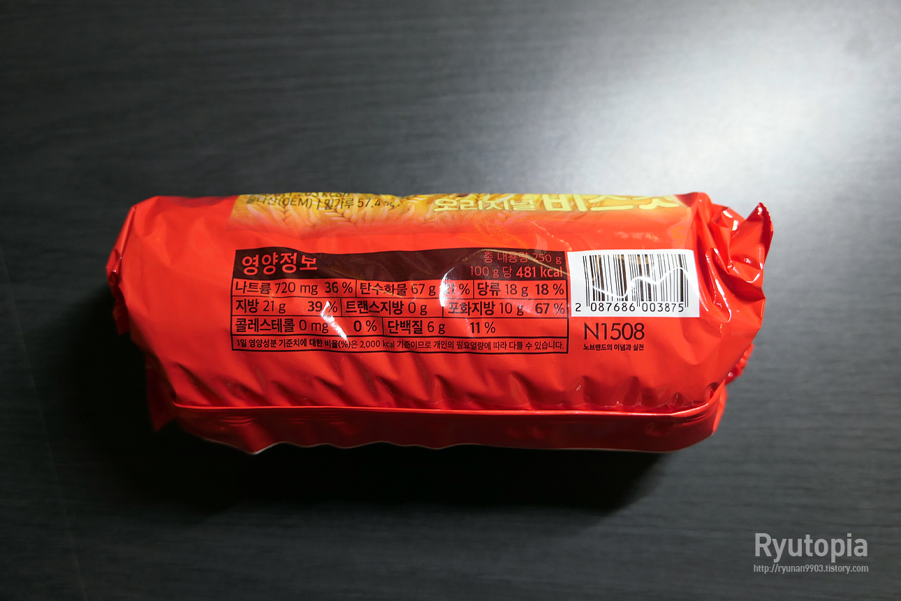 포장 측면의 영양성분표. 100g당 열량은 481kcal입니다.