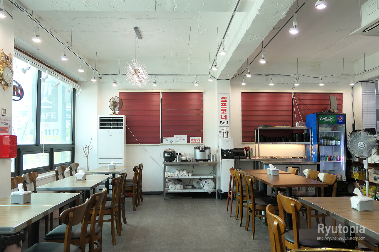 식기류를 비롯 밑반찬 등은 전부 셀프로 가져와야 합니다. 매장 안에 셀프 바가 비치되어 있어요.