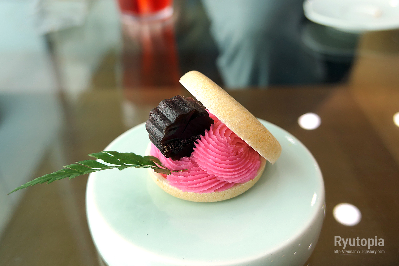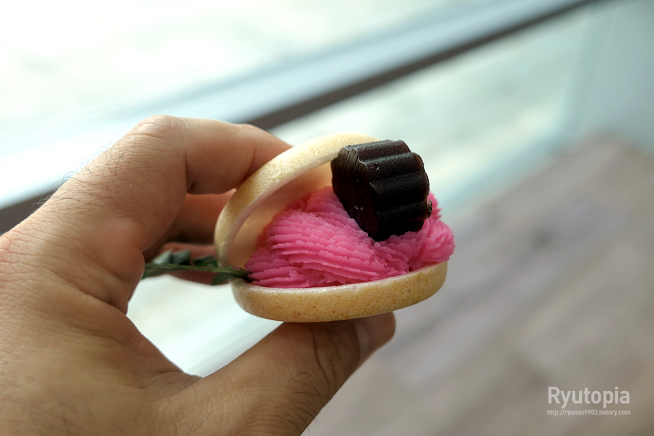 입 안 가득 꽉 차는 앙금의 향긋하고 달콤한 맛이 바삭한 쌀과자와 되게 기분좋고 달콤하게 어우러지는 맛이네요. 고급스럽습니다.