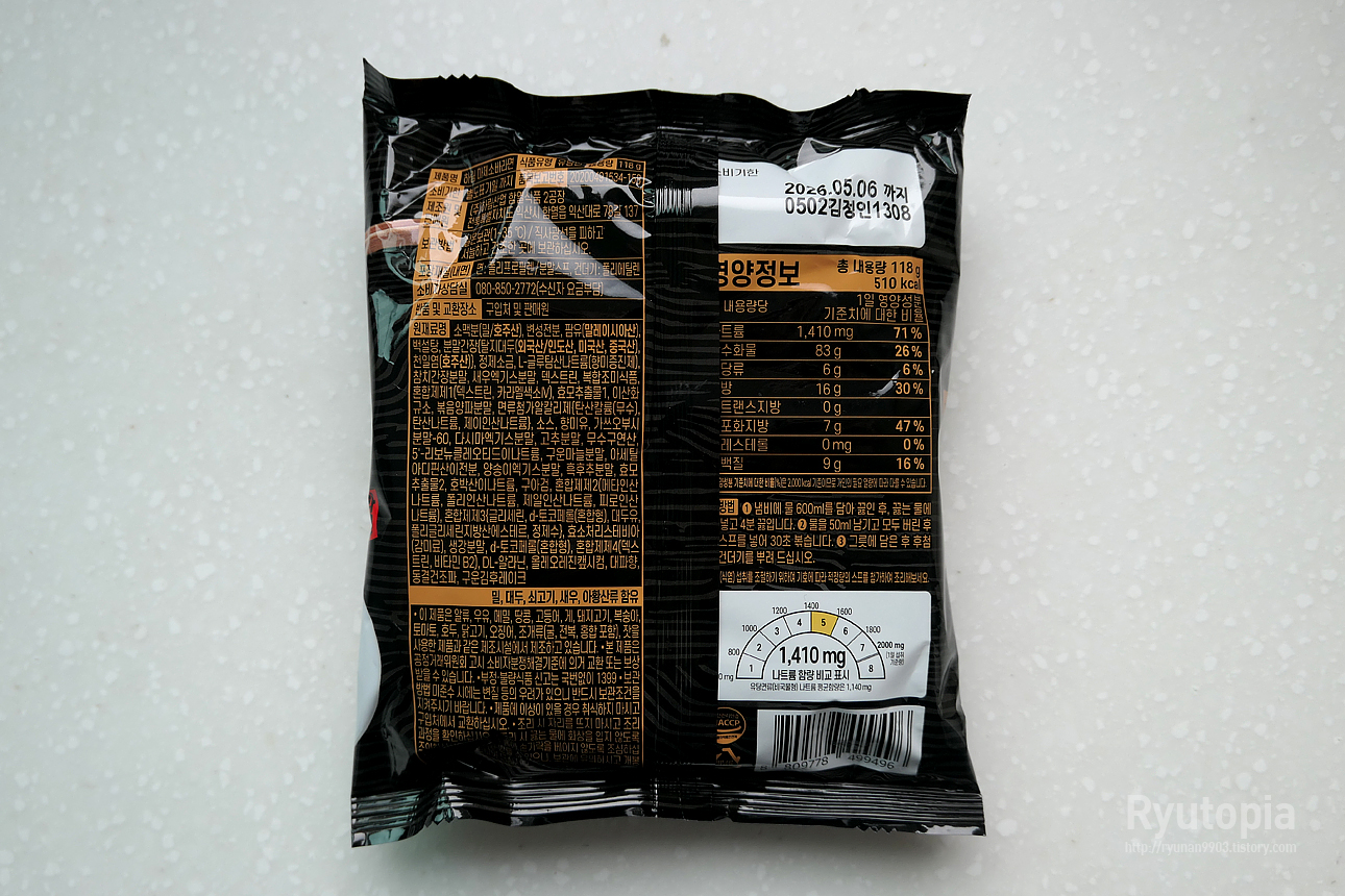 제품 후면의 원재료 및 함량, 영양성분표 등의 정보입니다. 한 봉지(118g) 당 열량은 510kcal.