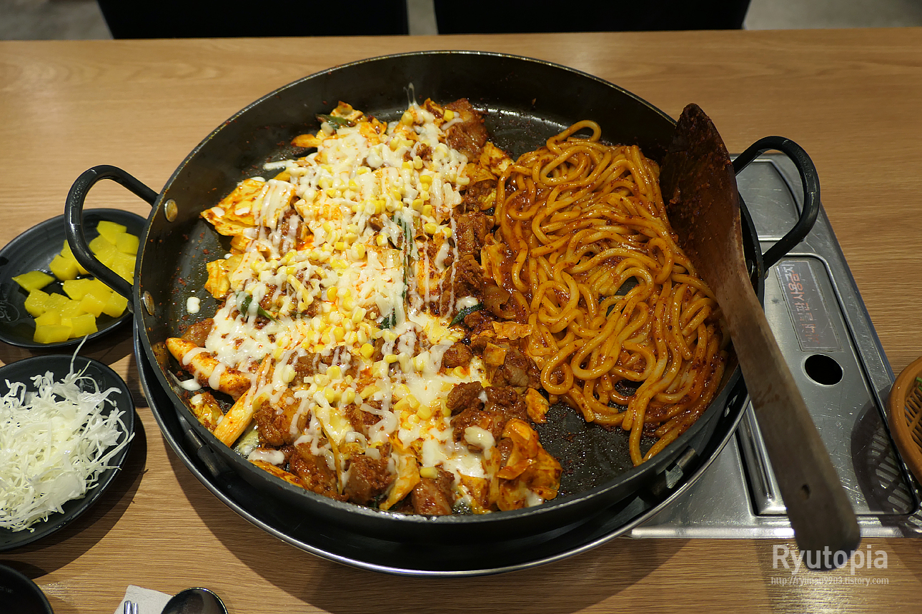 '콘치즈닭갈비(1인 11,500원, 사진의 양은 2인)' 에 '우동사리(2,000원)' 추가 구성.