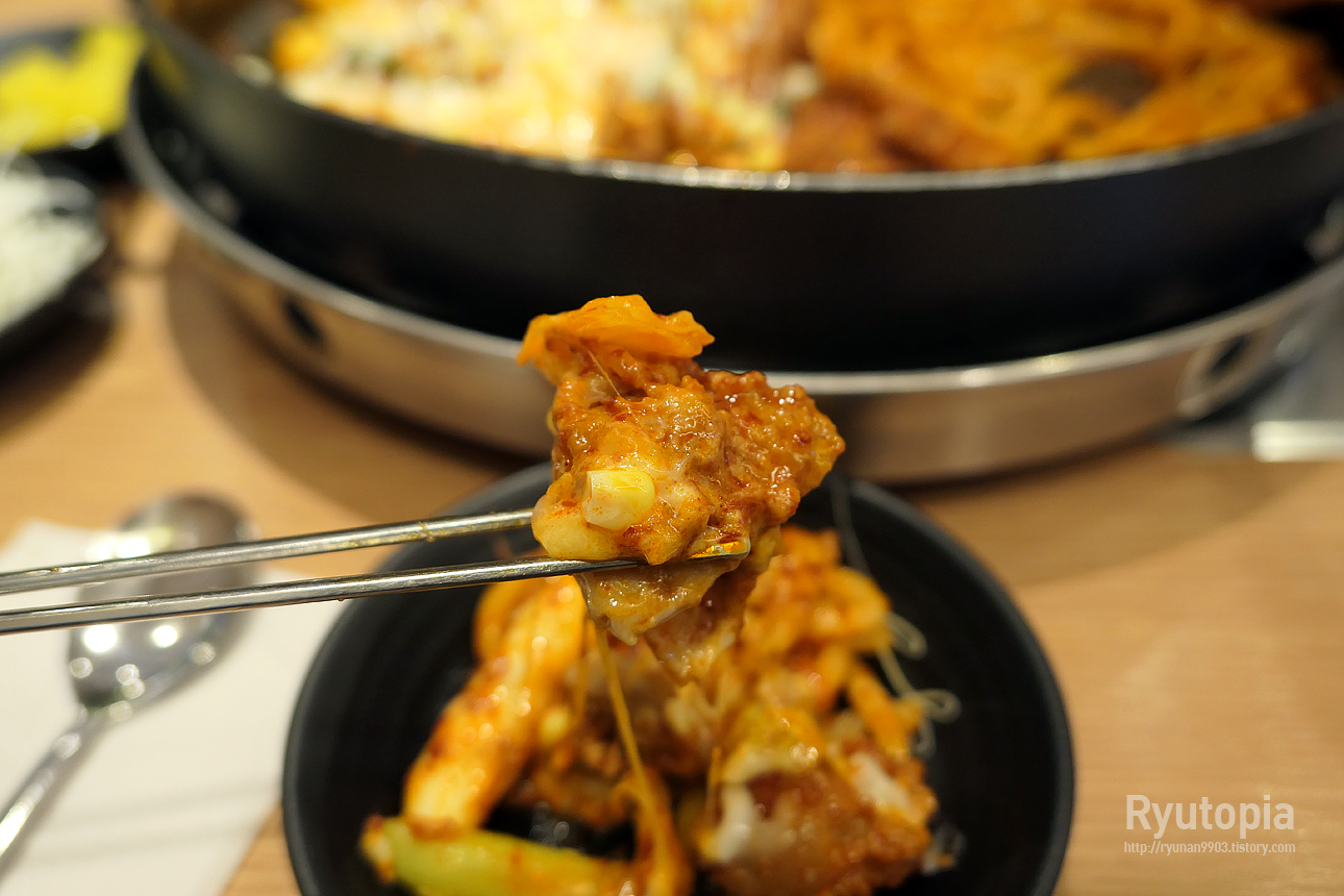 기본적으로 매콤한 양념의 닭갈비에 모짜렐라 치즈, 거기에 옥수수가 올라가니 고소한 맛 더해지면서 매운맛도 줄어드네요.