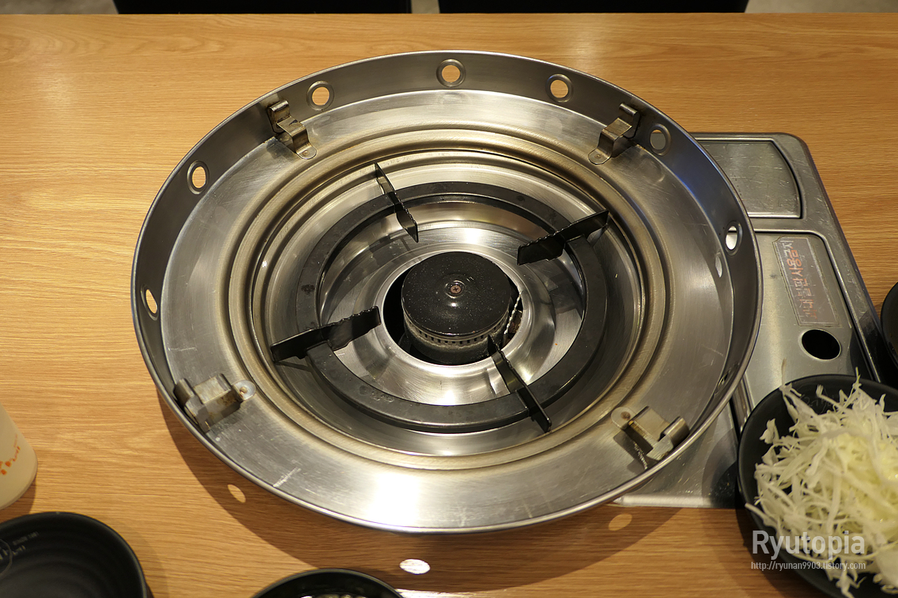 테이블마다 설치되어 있는 가스 불판.