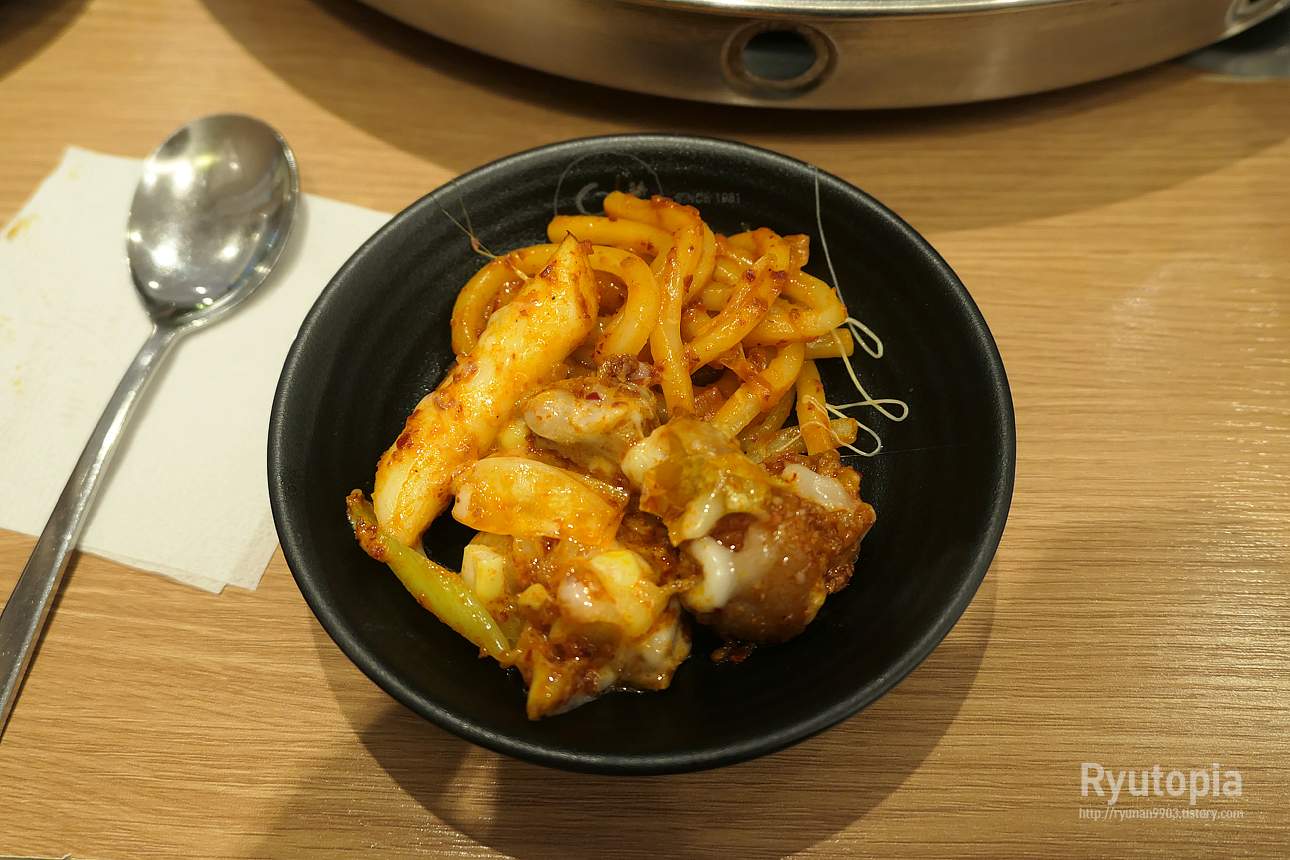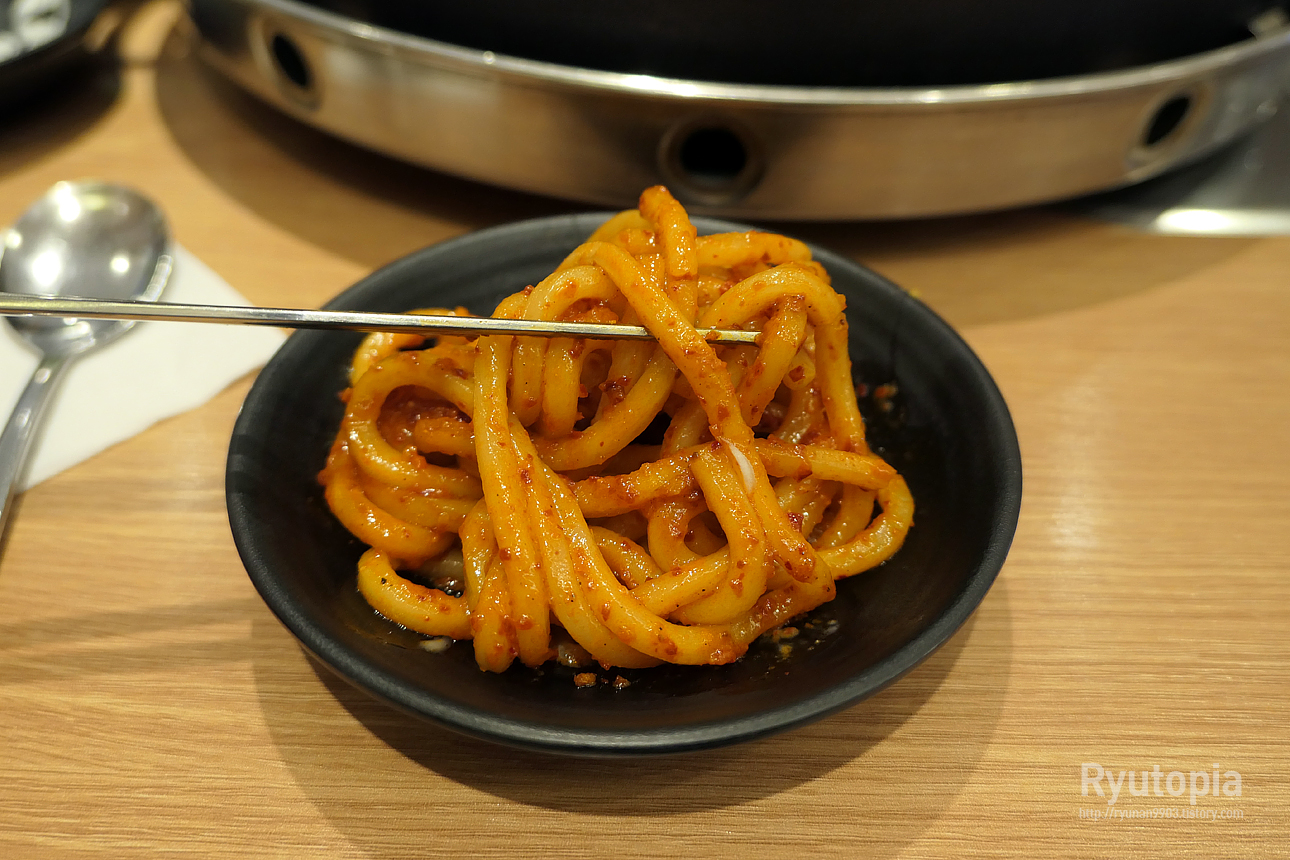 탱글탱글한 우동사리도 함께 즐겨줍니다. 확실히 느끼는 건데 닭갈비에는 라면사리보다 우동사리가 더 잘 맞는 것 같아요.