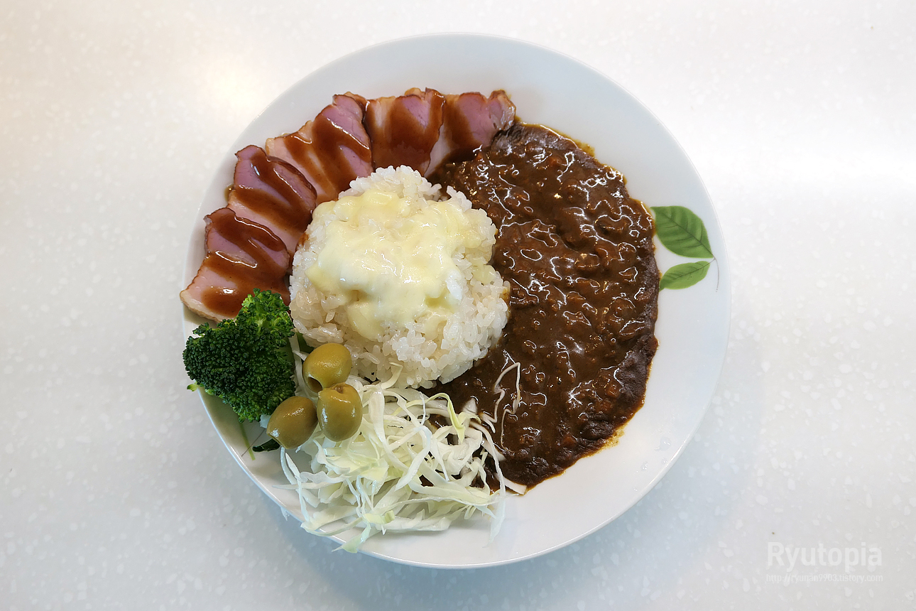밥 위에 얹은 건 모짜렐라 치즈입니다. 바베큐 돼지삼겹살, 브로컬리, 올리브, 양배추 등을 살짝 얹어 마무리.