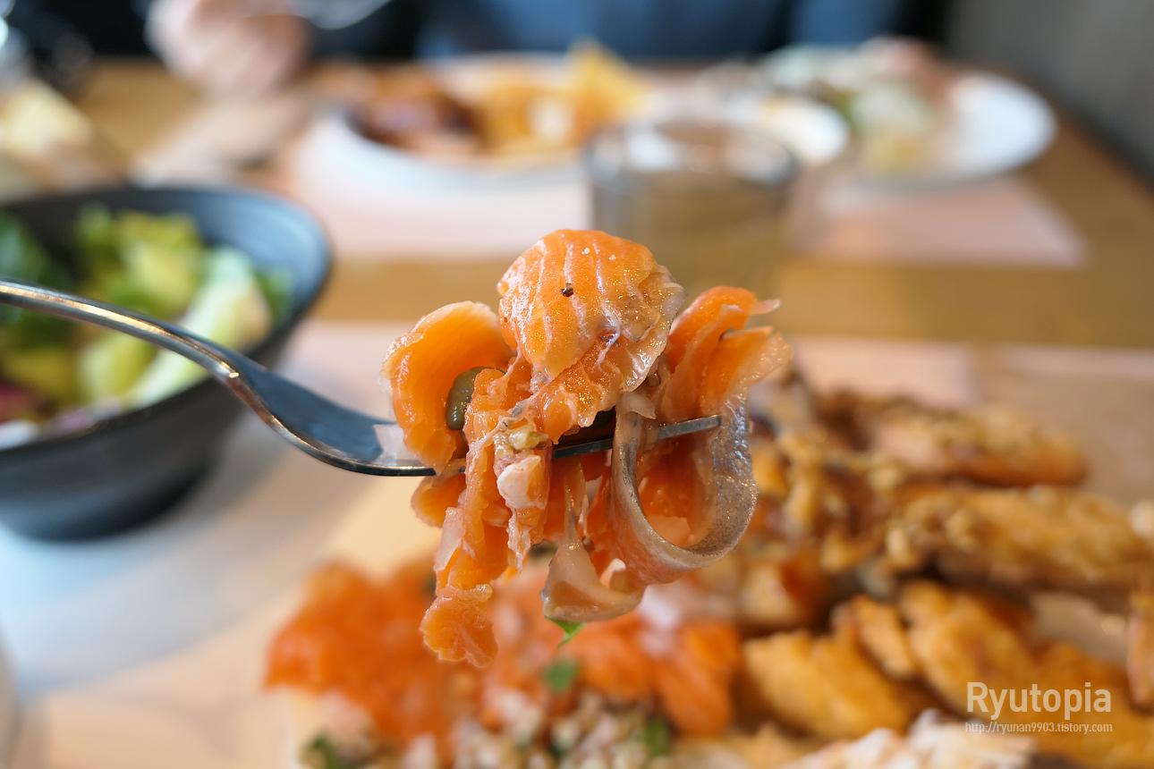 생연어가 아닌 훈제연어긴 하지만 그래도 신선한 것 듬뿍 가져와 입 안 가득 넣어 먹는 즐거움이 있습니다.