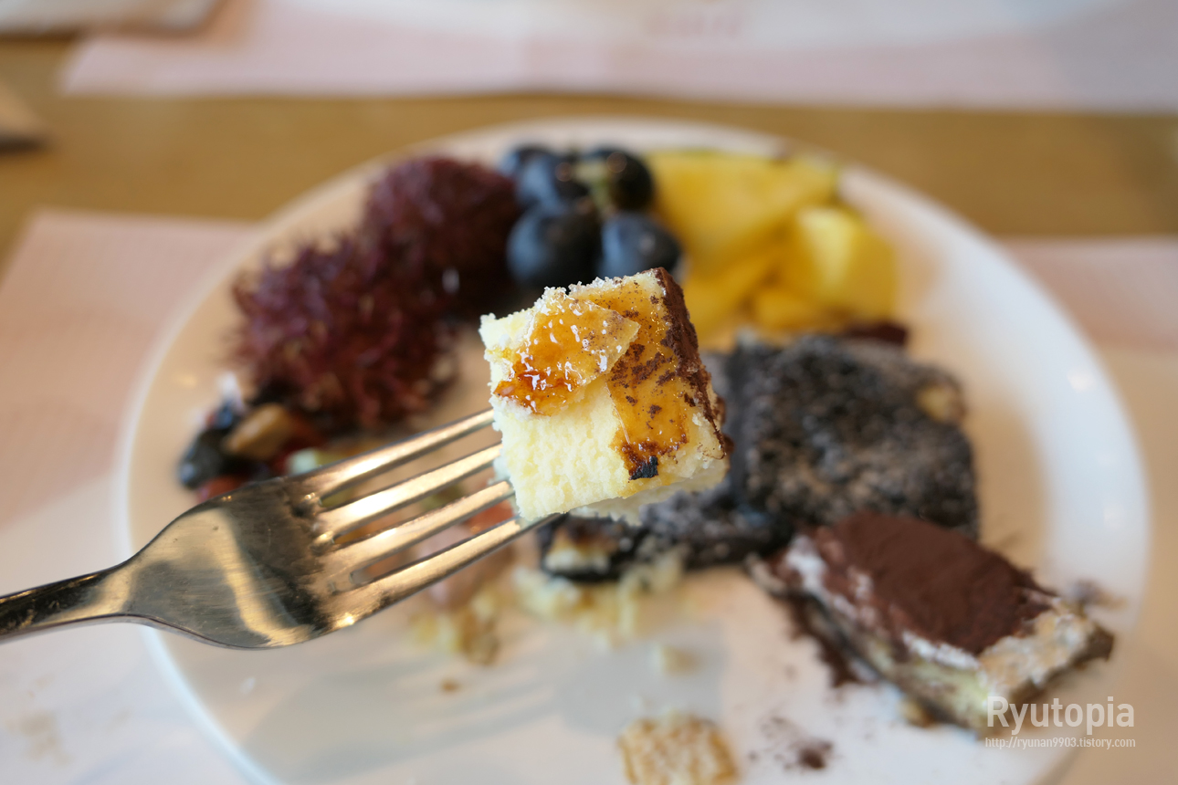 과일로는 람부탄, 적포도, 파인애플, 그리고 냉동망고가 준비되어 있었습니다. 케이크도 종류가 4~5가지 있었고요.