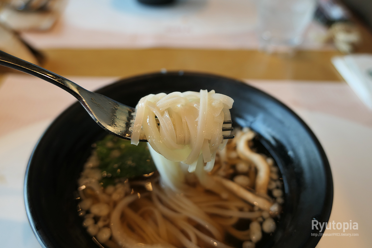 즉석요리 코너에서 우동도 한 그릇 만들어왔는데, 안에 들어가는 면을 우동면 반 쌀국수면 반으로 했어요.