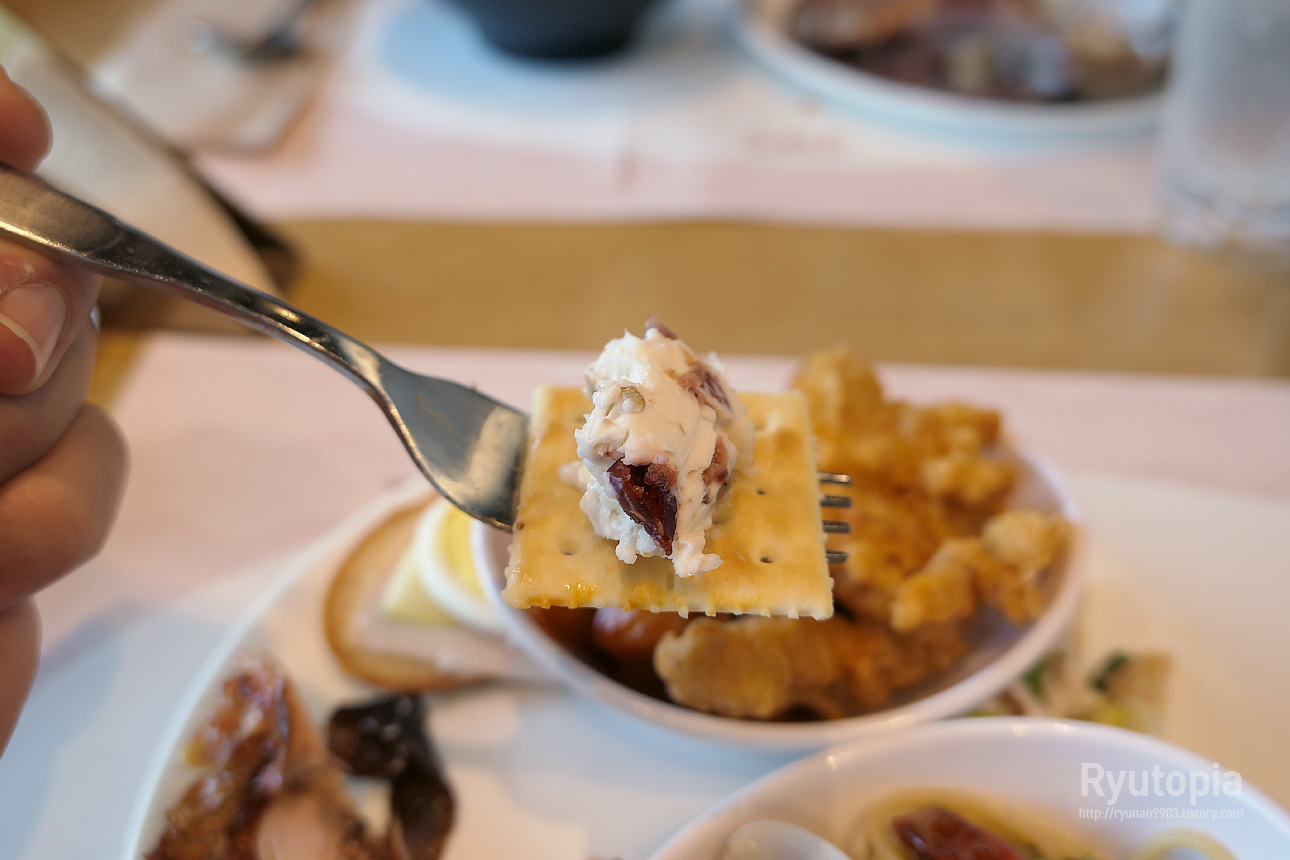 크랜베리와 견과류를 넣고 꾸덕하게 만든 크림치즈를 올린 크래커.