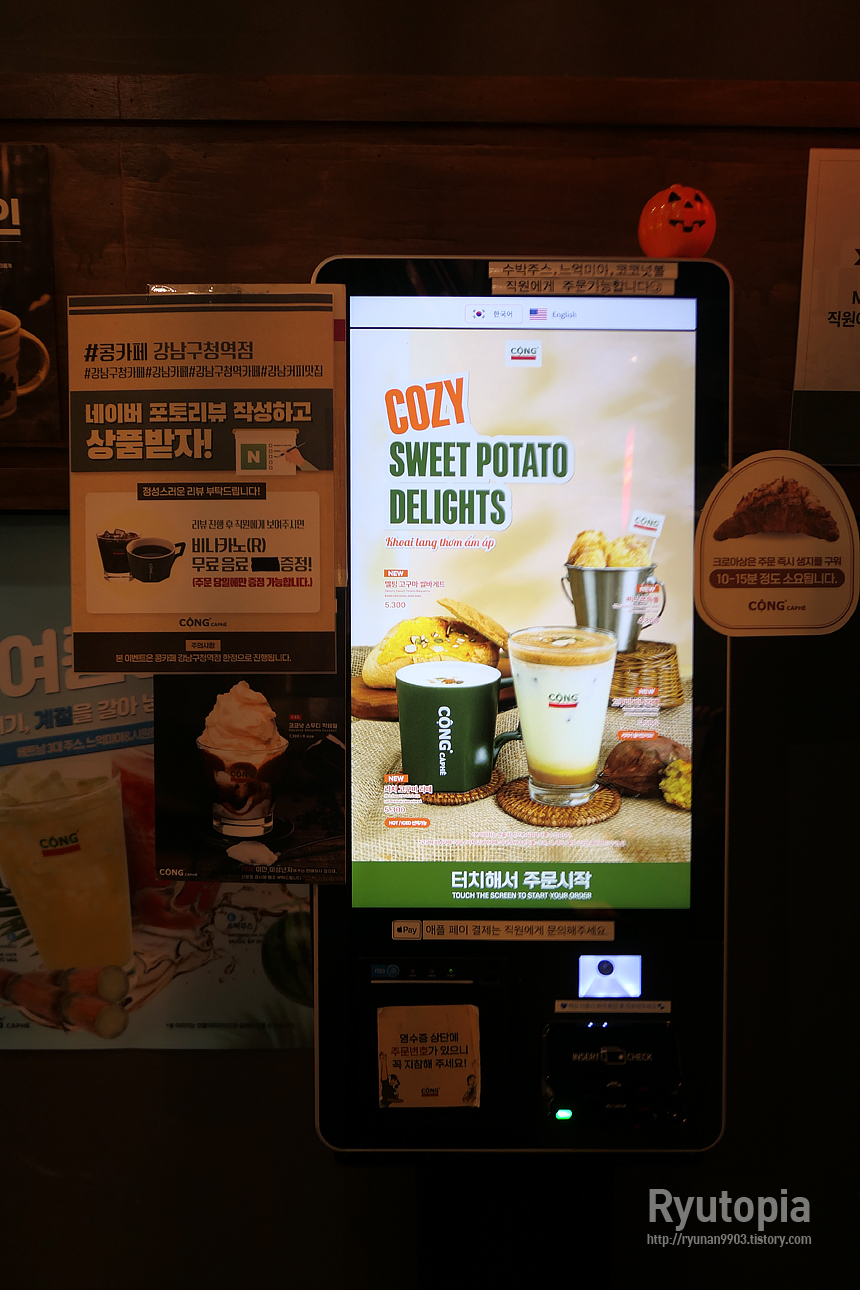 주방 옆에 무인 키오스크 기기가 설치되어 있어 이 쪽을 통해 주문할 수 있습니다.