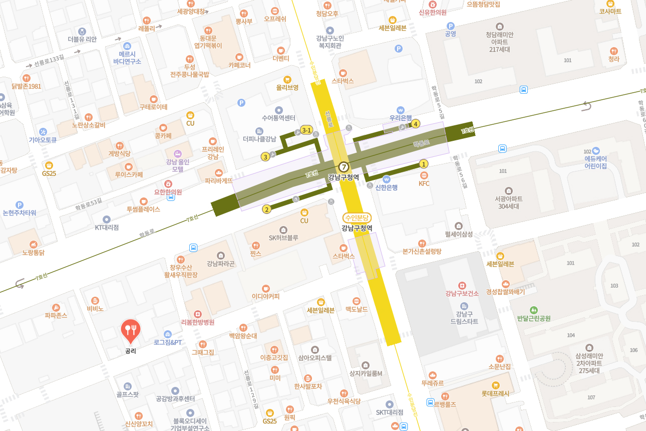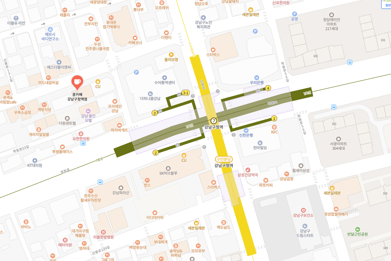 ※ 콩카페 강남구청역점 찾아가는 길 : 지하철 2, 수인분당선 강남구청역 3번출구 하차 후 파리바게뜨 골목 우회전, CU에서 좌회전