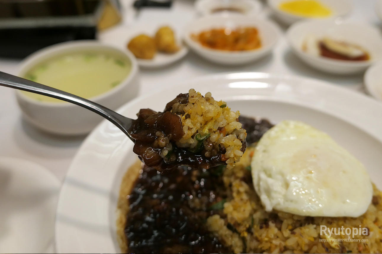 다른 가게 볶음밥의 짜장소스는 그 양이 조금 적게 살짝 담겨나오는 것과 달리 여기는 뭐랄까 꽤 많은 양의 소스가 담겨있습니다.