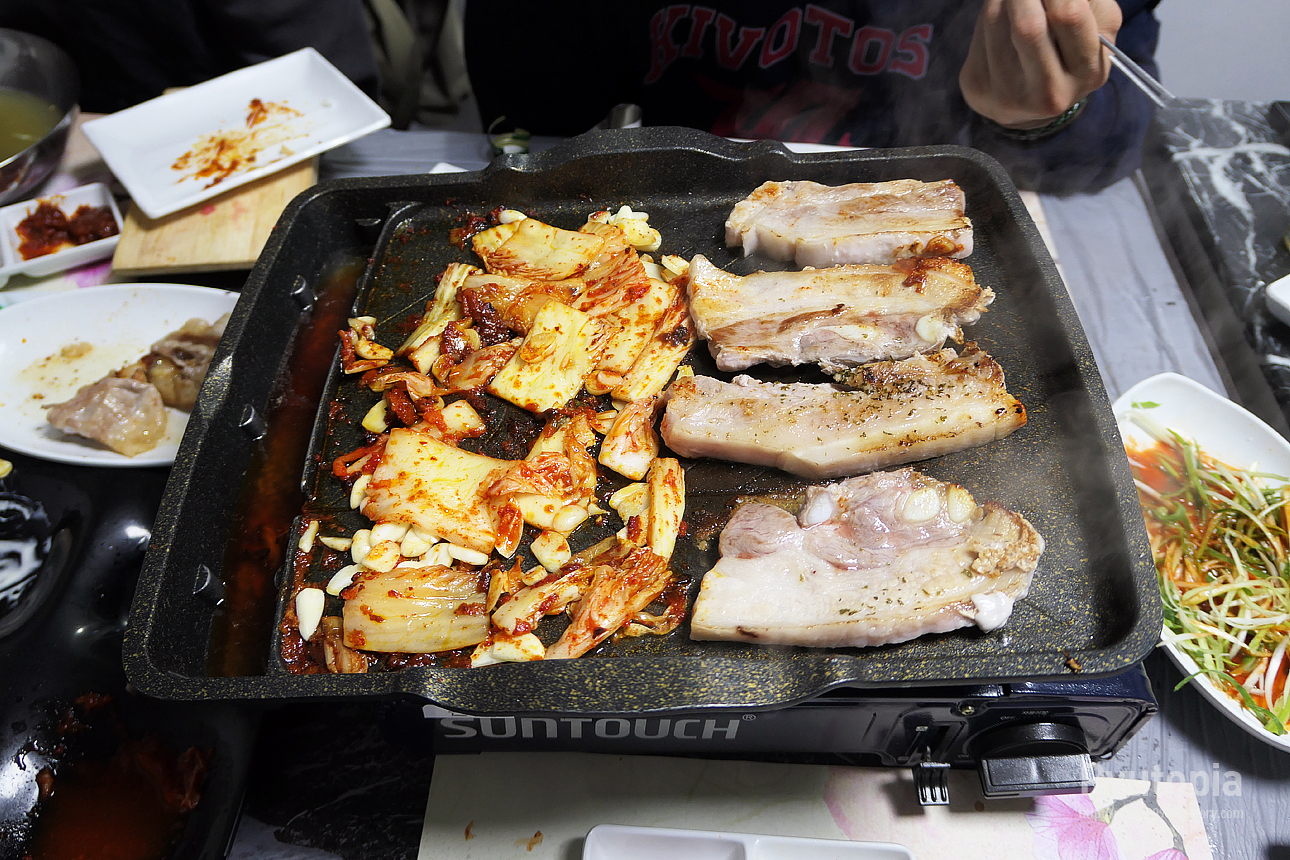 김치도 그에 맞춰 거의 불판 위에 절반을 마늘과 함께 가득 올려놓고 함께 구웠습니다.