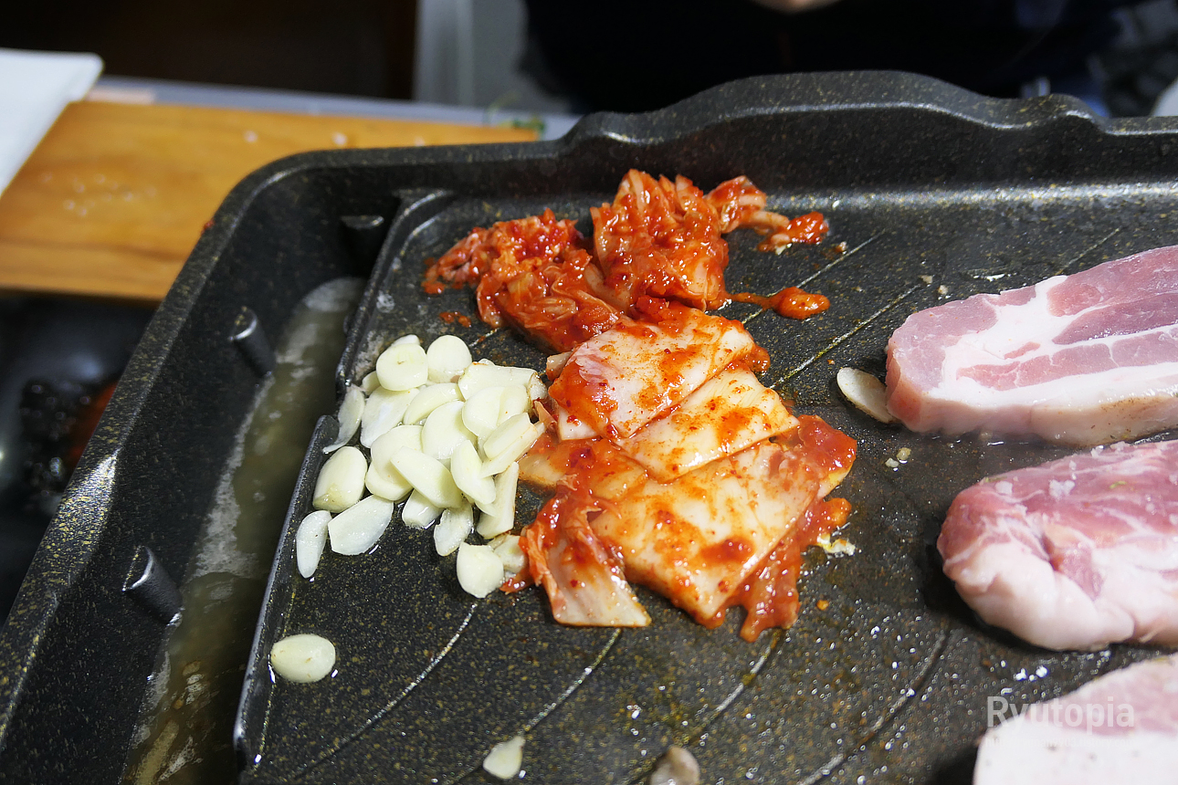 생삼겹살 올림과 동시에 슬라이스한 생마늘, 김치도 돼지기름 떨어지는 쪽에 함께 올려 굽기 시작했습니다.