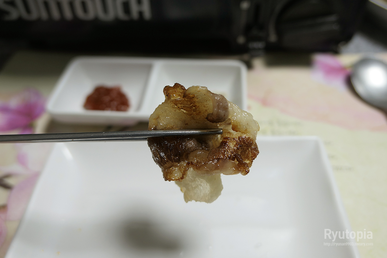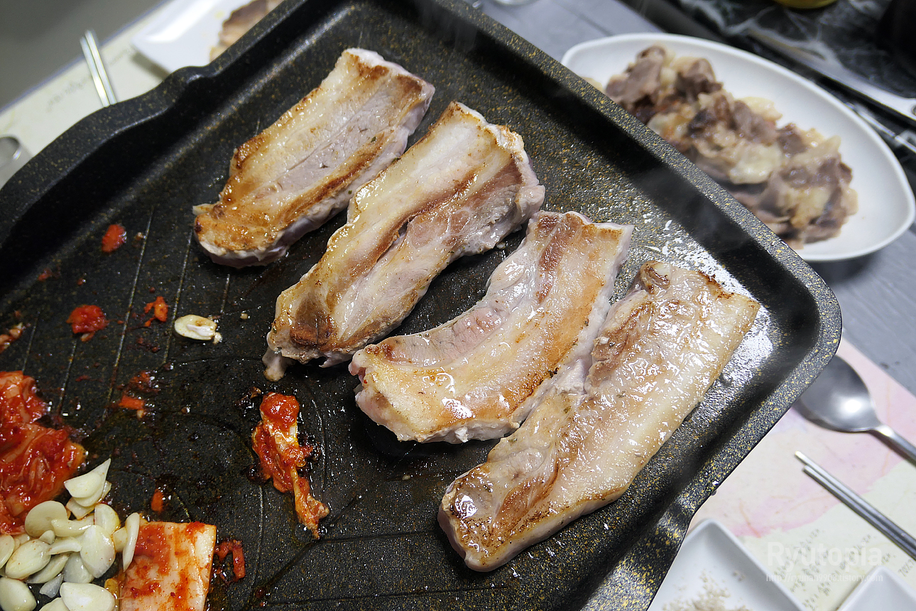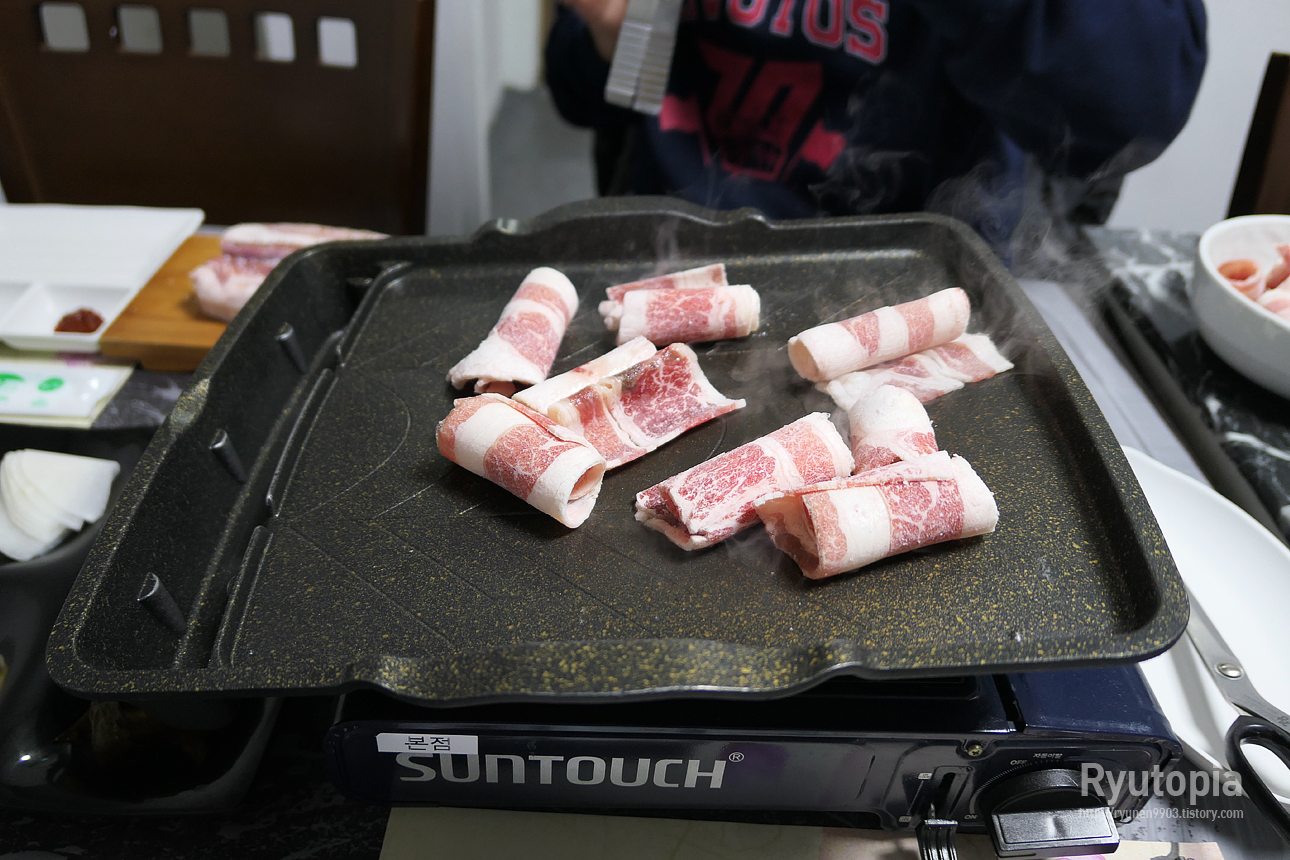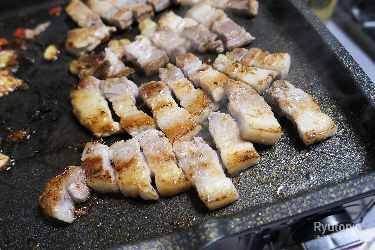 얇게 썰어낸 고기라 불판 위에서 금방 익기 때문에 생삼겹살 같은 두꺼운 고기 구워먹기 전 가볍게 시작하기 좋습니다.