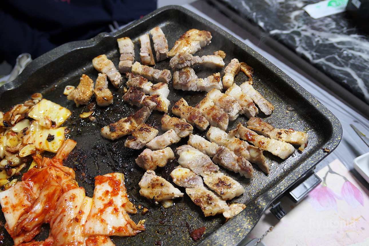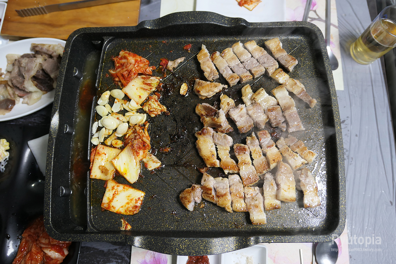 생삼겹살 구운 불판 위에 바로 올려 이어 굽기 시작.