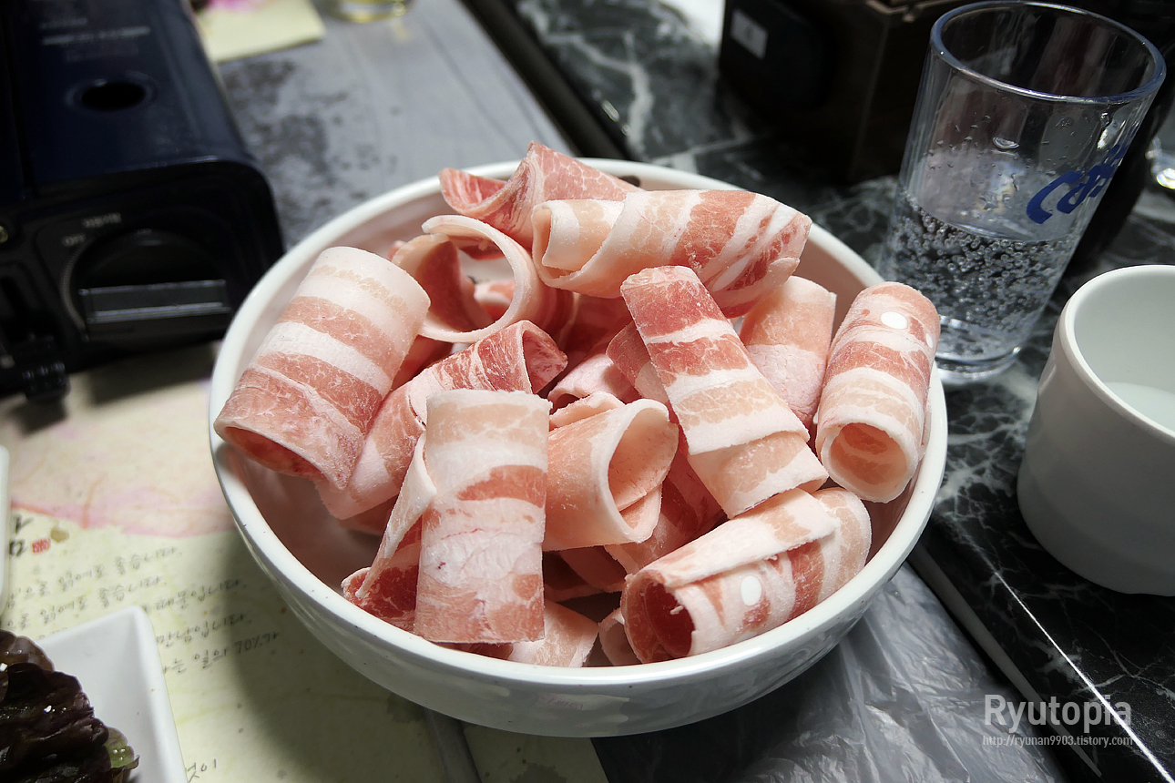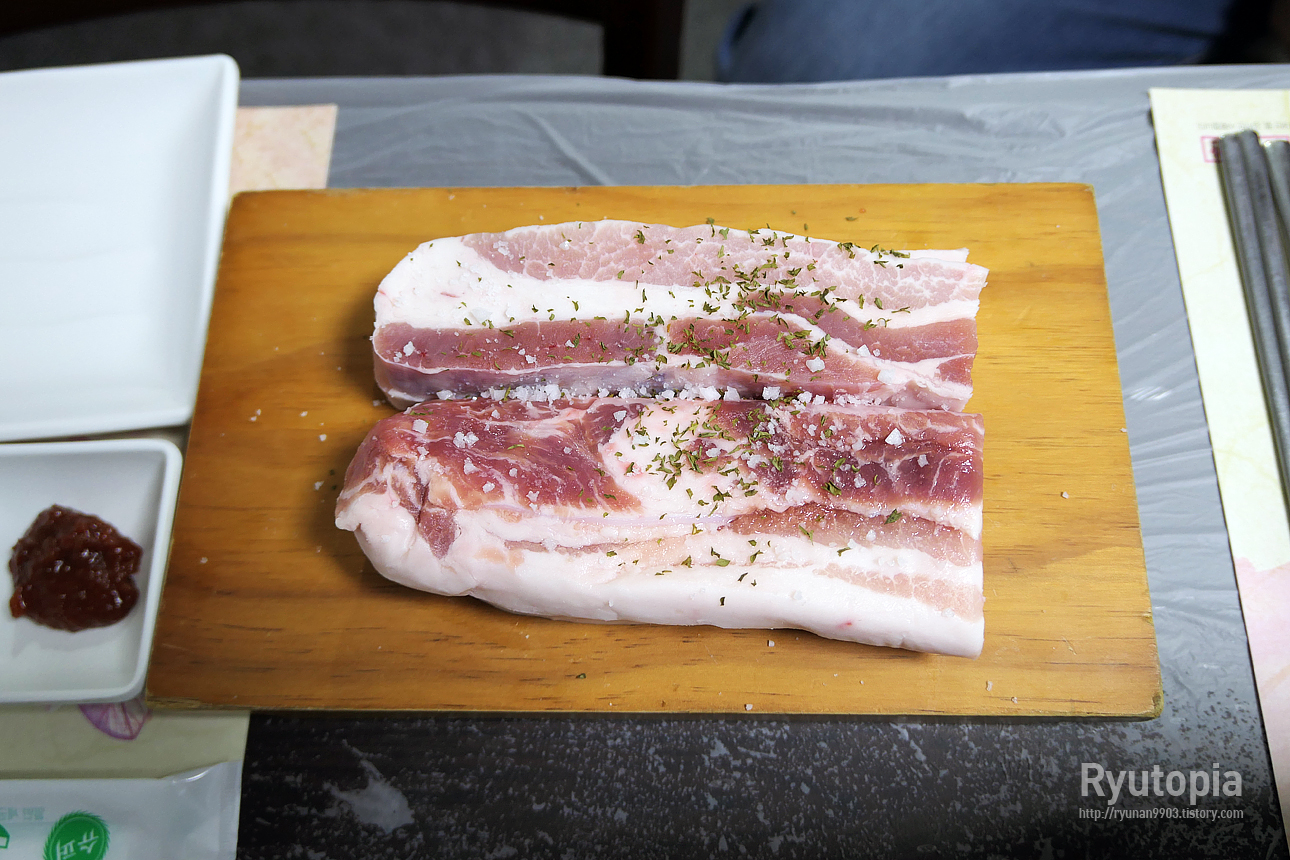 고기가 약간 모자라다 싶어 생삼겹살 2인분 추가 주문.