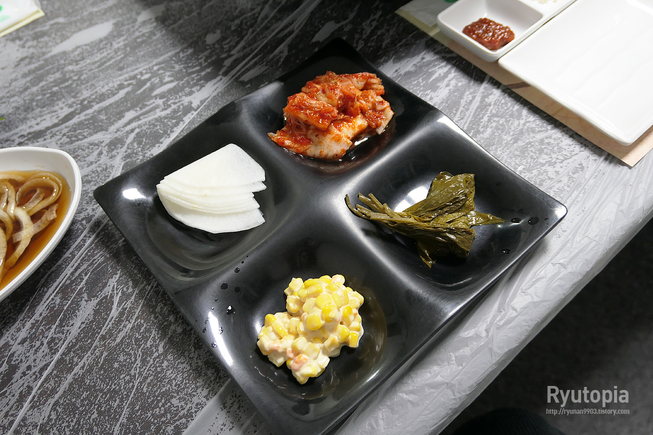 무초절임쌈, 배추김치, 깻잎장아찌, 그리고 옥수수콘 샐러드는 네 공간으로 나눠진 전용 그릇에 담겨나옵니다.