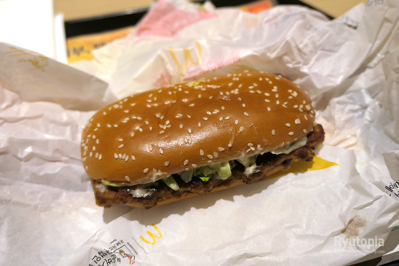 구성은 돼지고기 패티, 그리고 마늘향이 나는 전용 소스, 양상추, 슬라이스한 양파, 그리고 마요네즈로 구성되어 있습니다.