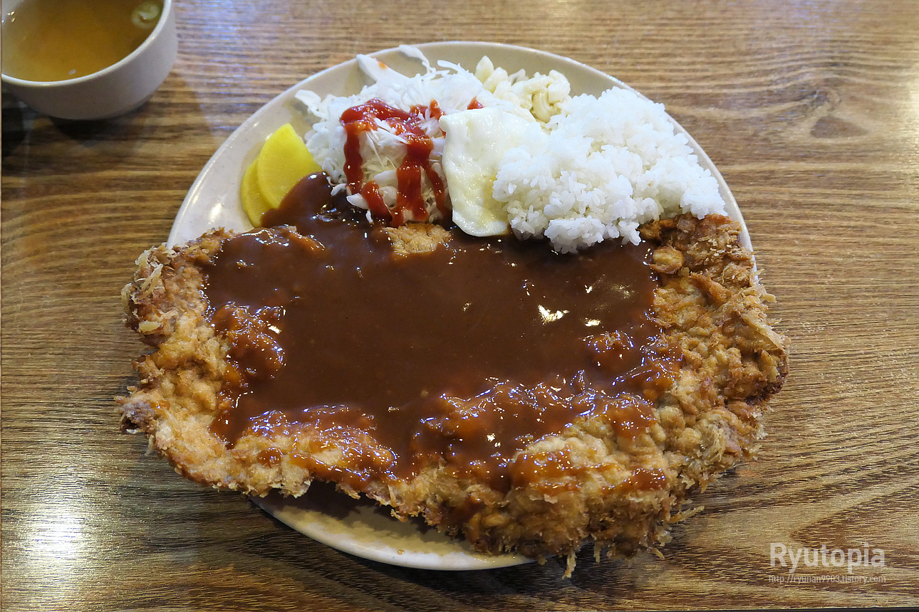 접시를 비집고 나갈 정도로 어마어마하게 큰 돈까스 한 덩어리가 그 아래 소스를 뿌린 상태로 펼쳐져있는데