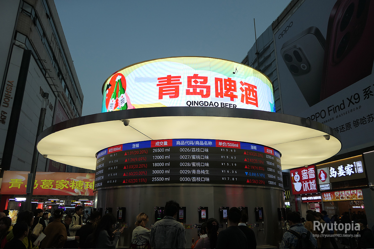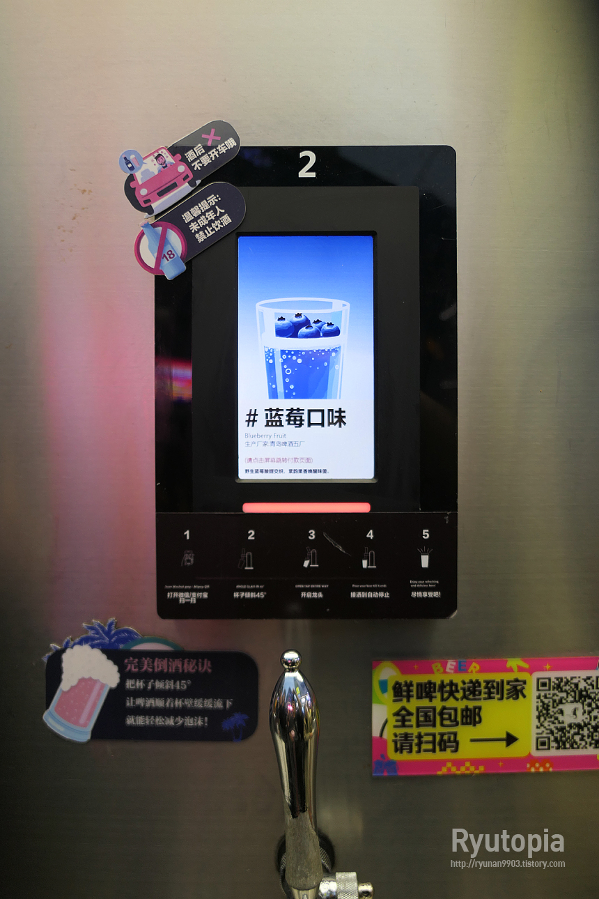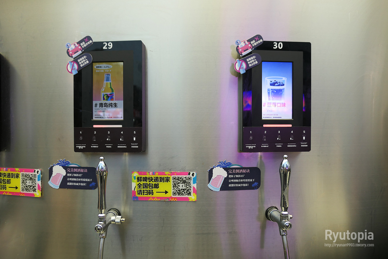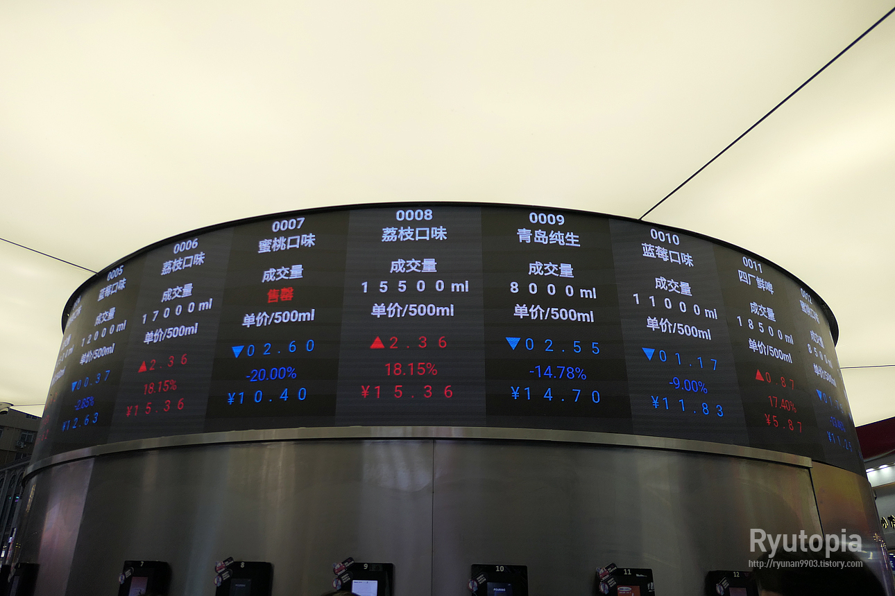 천장에 거대한 원형 칭다오맥주 간판이 환하게 불을 밝히고 있고, 그 아래 수많은 맥주 디스펜서가 원통에 나란히 달려있어