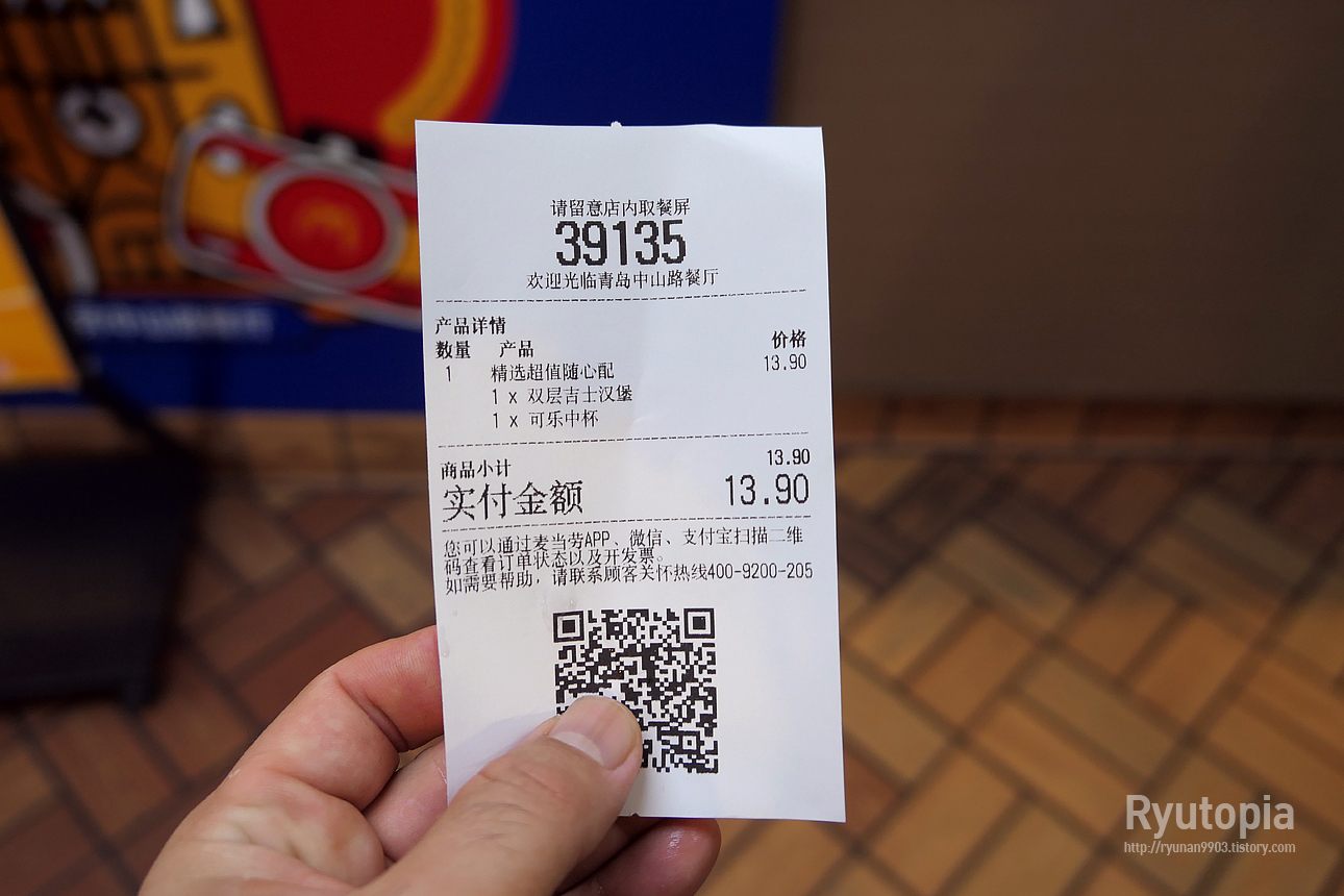 나는 이 중에 '더블 치즈버거 + 콜라' 콤보 할인 메뉴가 있어 그걸 선택. 가격은 13.9위안, 우리돈으로 약 2,800원 정도.