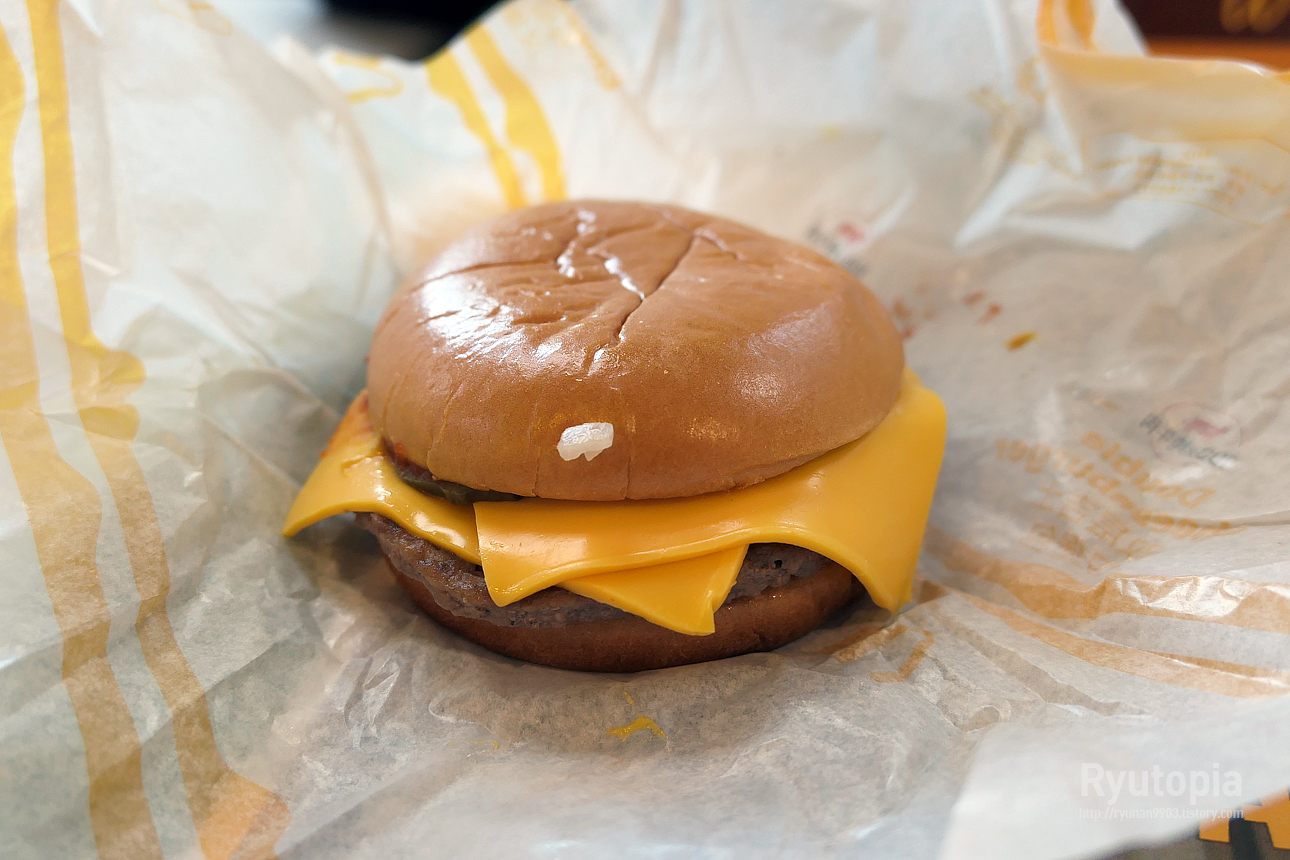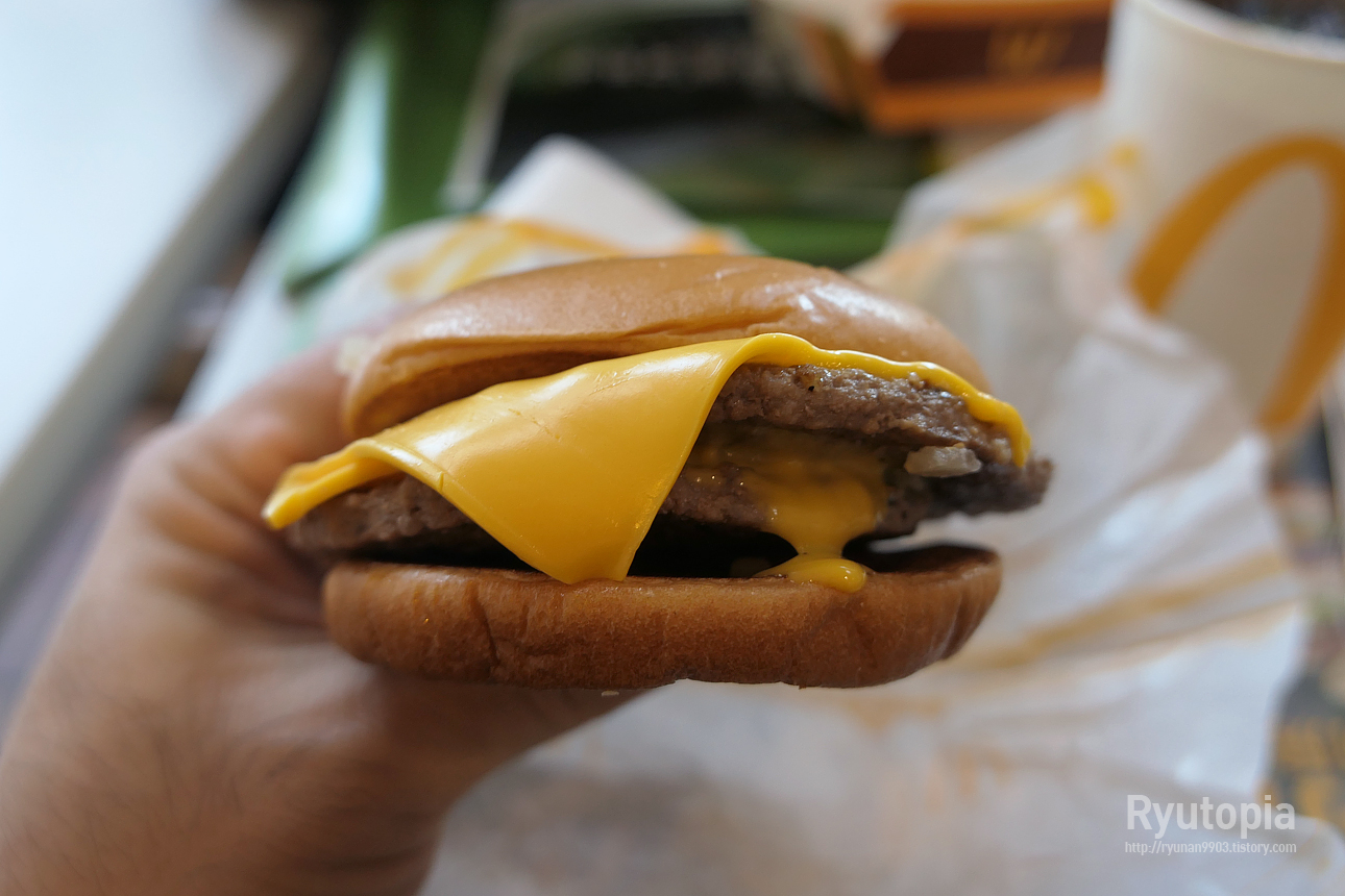 참깨번이 아닌 일반 번에 체다 슬라이스 치즈 두 장, 그리고 쇠고기 패티 두 장. 구성 자체는 우리나라의 그것과 동일.