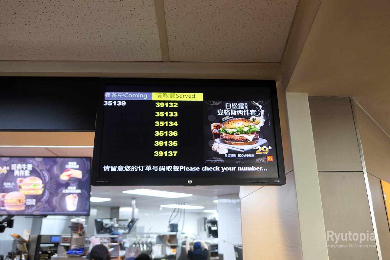 대한민국 맥도날드와 마찬가지로 음식 받는 픽업 매대 바로 위에 모니터가 있어 모니터를 통해 내 번호 확인이 가능.