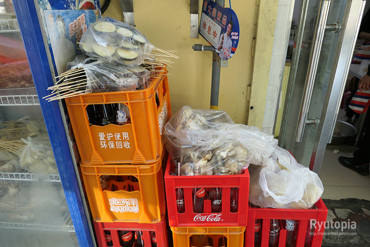 가게 안쪽의 쇼윈도에 각종 꼬치 재료가 어지럽게 널려 있음. 그래, 이게 중국의 꼬치구이지.