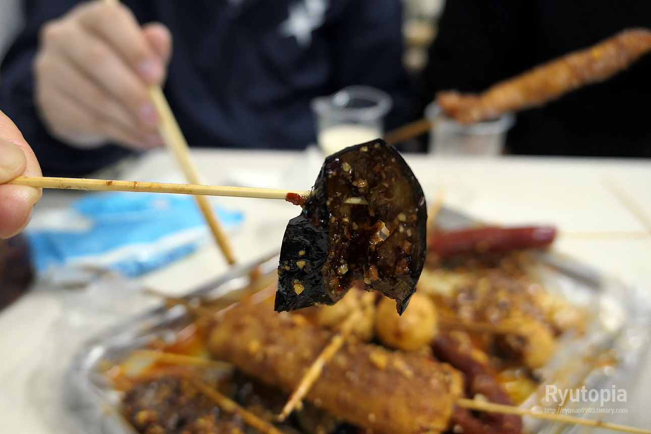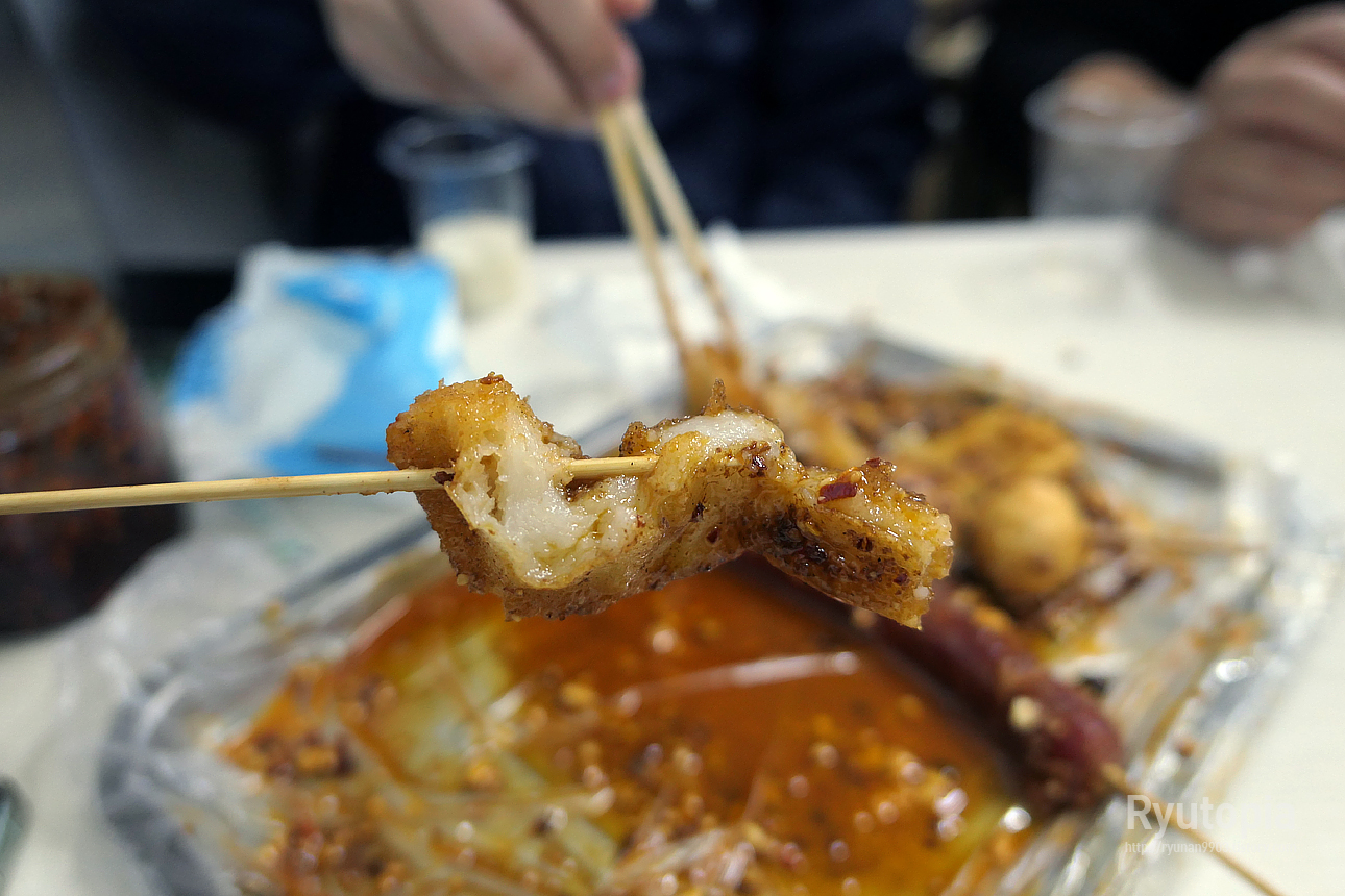 쫀득쫀득하게 씹히는 어묵을 튀김옷 없이 기름에 통째로 튀겨 그 위에 고추기름 베이스의 소스를 듬뿍 뿌려 마무리한 꼬치.