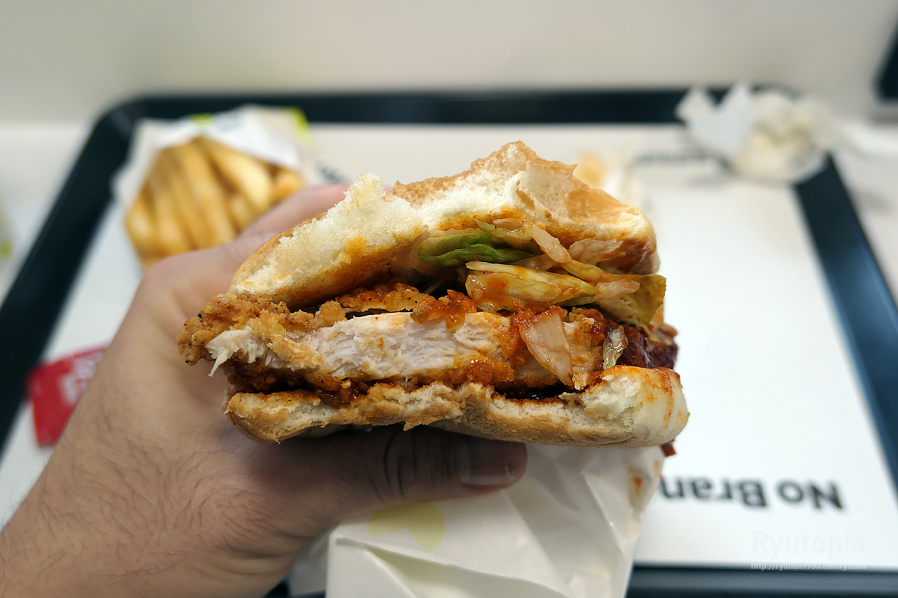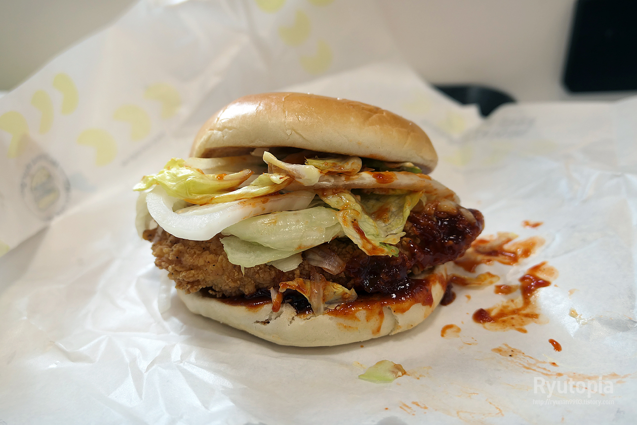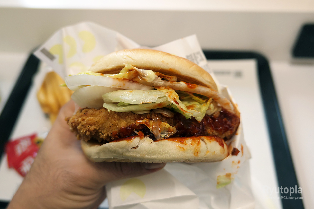 버거 구성은 치킨 패티 위아래에 새빨간 고스트페퍼 소스, 그리고 그 위로 양상추와 양파, 마요네즈를 얹어 마무리하였습니다.