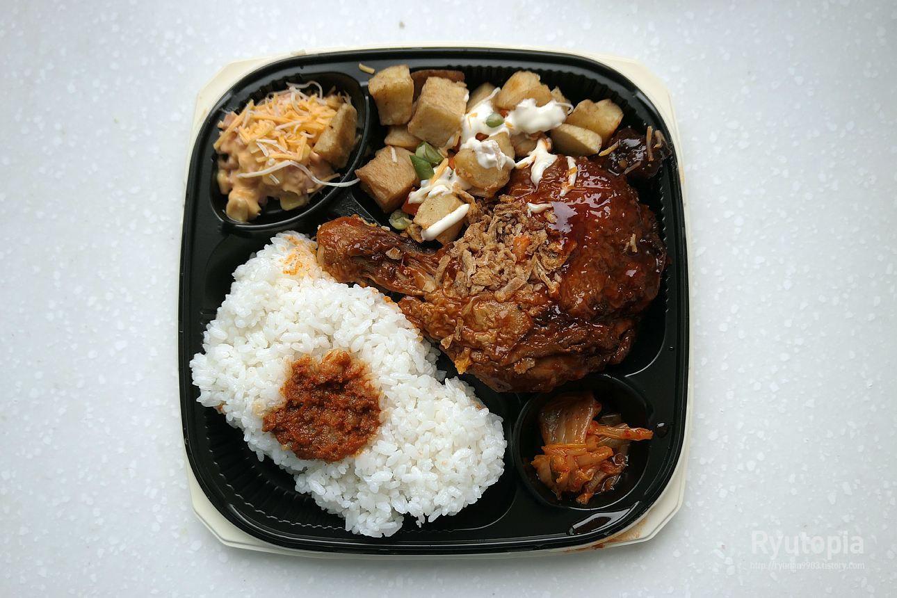 일단 흰쌀밥 위에는 고기와 볶은 쌈장 소스가 발라져 있고요, 양념 소스에 버무린 통닭다리와 함께 사이드로 깍둑썰기한 구운감자,