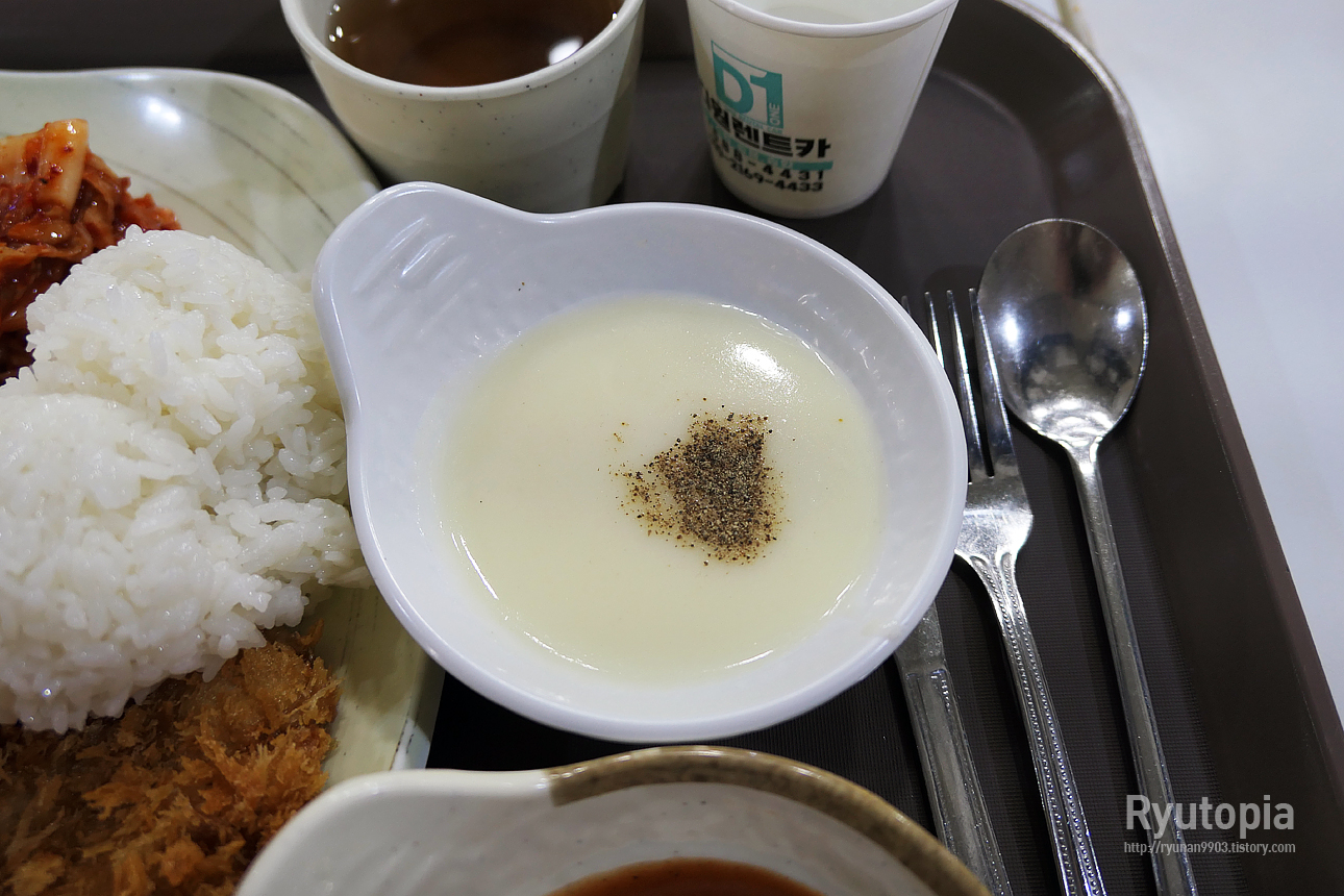 크림수프가 함께 나왔는데, 후추는 미리 살짝 뿌려져 나와요. 그냥 가볍게 호로록 떠먹기 좋은 식전 크림수프고요...