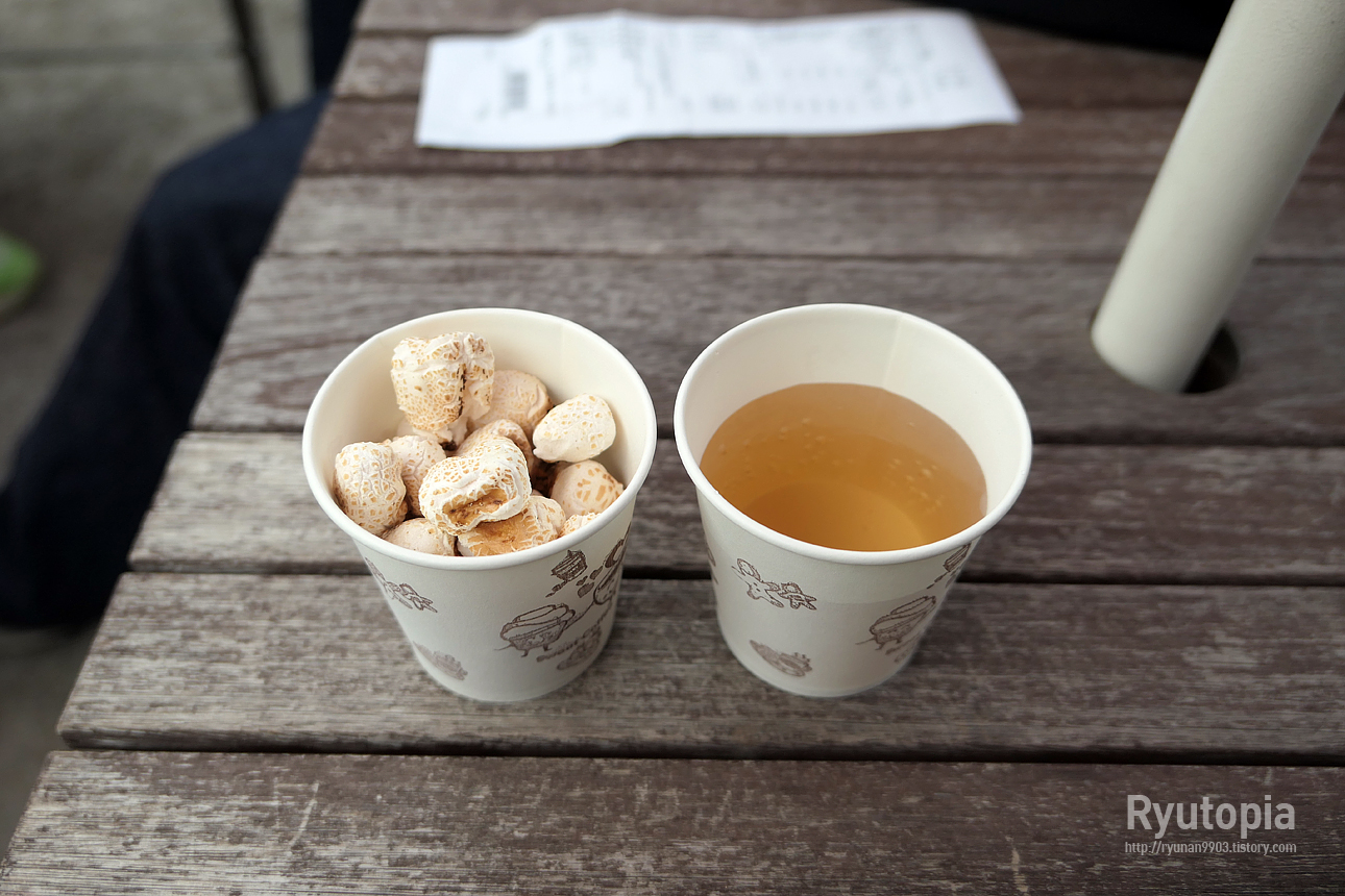 따끈한 강냉이, 그리고 온수기에 들어있는 건 따끈한 헛개차.