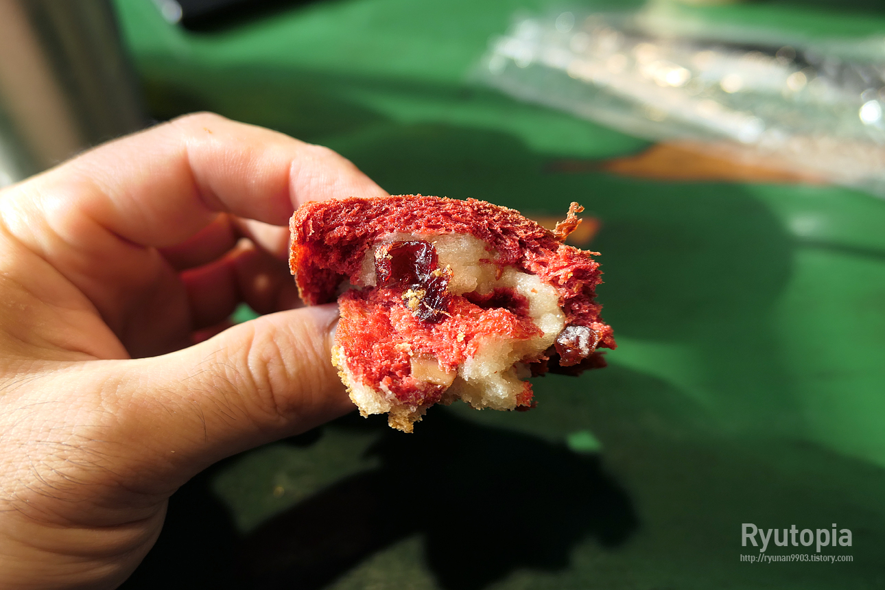 그냥 식빵이 아닌 홍국쌀가루를 넣어 만든 붉은 식빵 안에 크랜베리, 그리고 치즈가 들어가 고소하고 새콤한 맛이 나는 식빵.