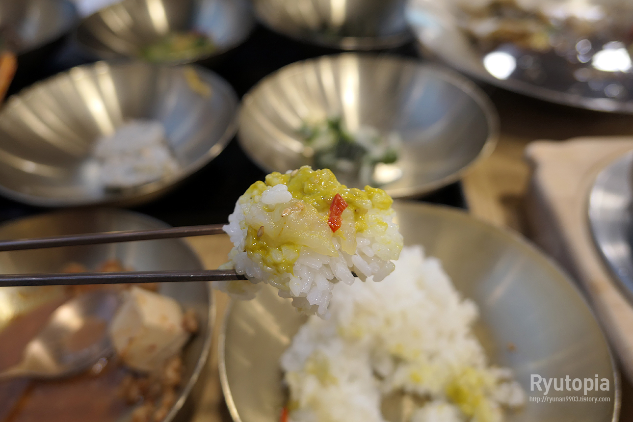 여기 청국장도 냄새 없애고 구수하게 끓인 청국장이라 이렇게 비벼먹어도 그냥 된장 먹는 기분입니다.
