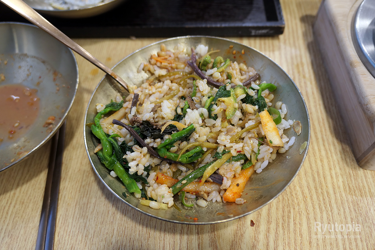 기본으로 나오는 솥밥의 양이 많지 않은 편이라 재빠르게 먹어치우고 대접 위에 추가밥과 셀프 바의 나물을 이것저것 담았습니다.