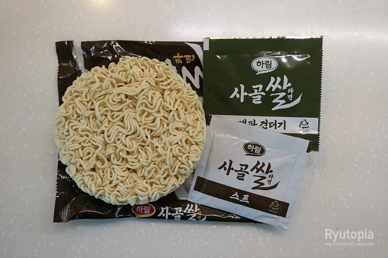 뽀얀 국물의 라면이라고 보시면 됩니다. 면에 국내산 쌀을 넣어 함께 만들었다고 하네요.