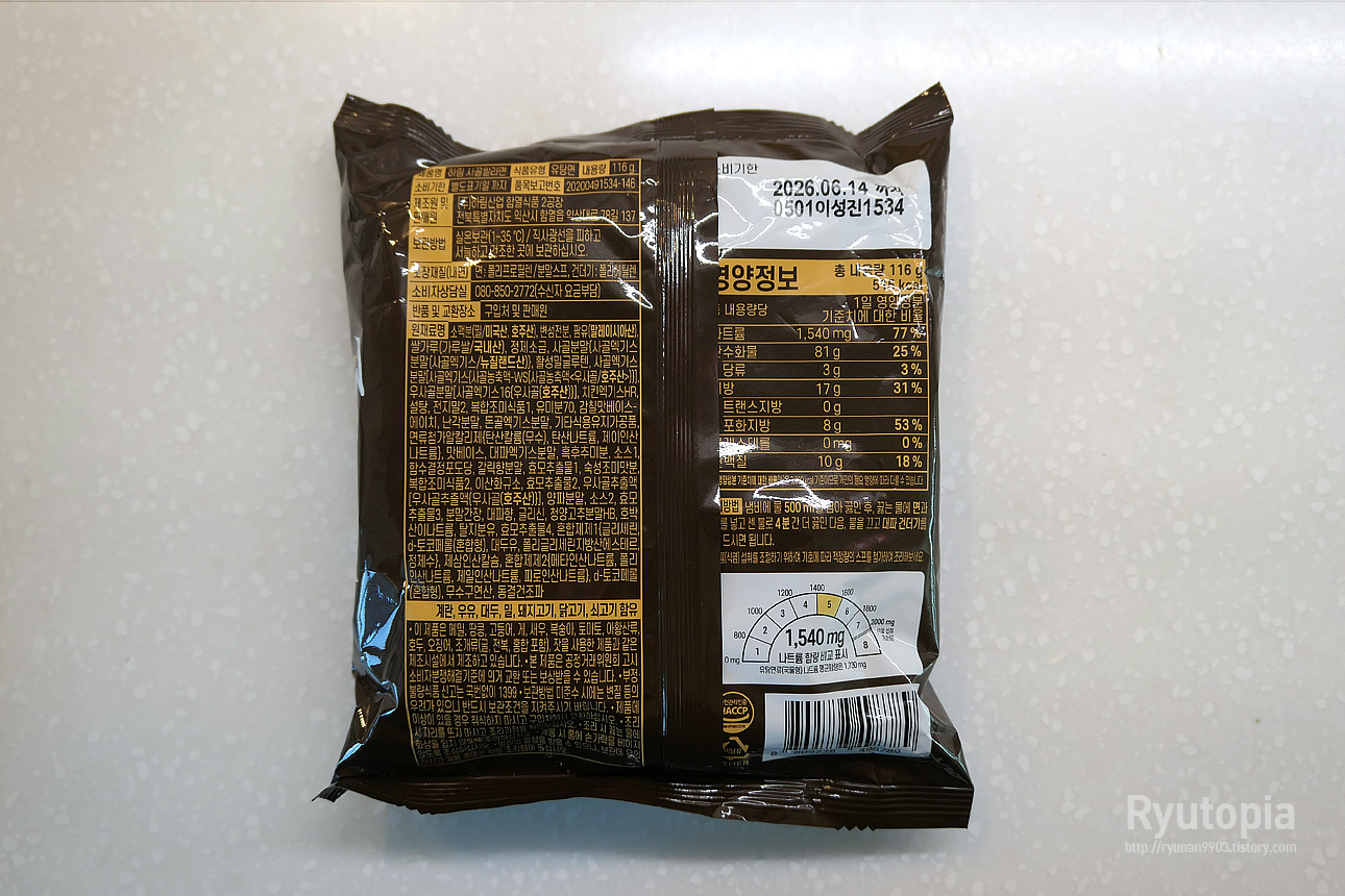 제품 포장 후면의 원재료 및 함량, 그리고 영양성분표 정보입니다. 한 봉지(116g) 당 열량은 535kcal입니다.