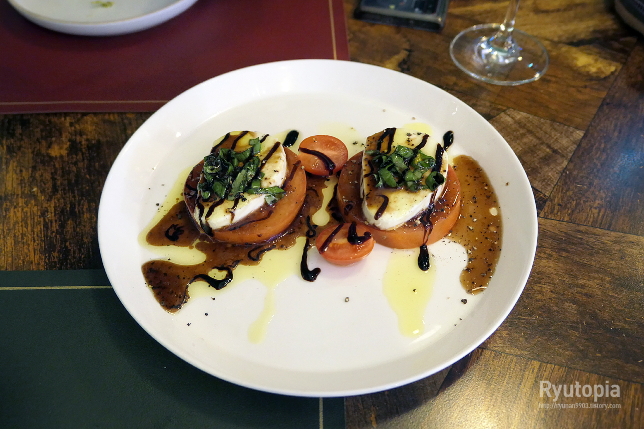 모짜렐라 치즈와 토마토, 그리고 그 위에 발사믹 소스와 올리브 오일을 뿌려 마무리한 요리로 방울토마토도 하나 함께 나오네요.